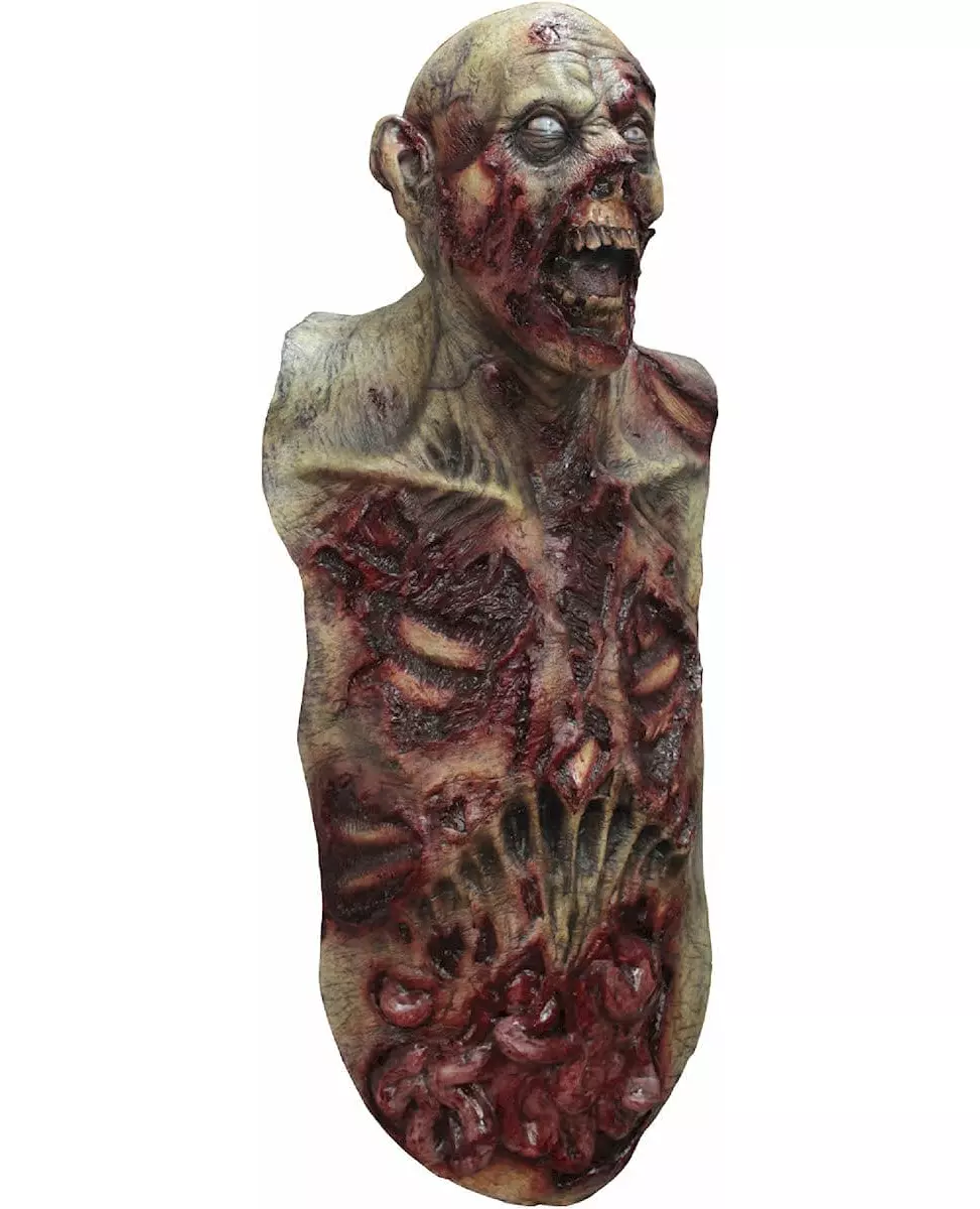 En vandrende skrekk! Denne lateksmasken er designet for voksne. Masken er fullstendig håndmalt og fanger perfekt utseendet til en råtnende zombie med et ytterst grufullt uttrykk! Den dekker også hele torsoen og skjuler den med synlige innvoller som blander seg med de dype sårene. Dessuten avslører zombiens fullstendig råtne ansikt glassaktige, blodskutte øyne og en munn med løse, blodige tenner. Til slutt er masken enkel å ta på takket være åpningen i nakken. Bruk dette tilbehøret med zombiekostymet ditt og sett vennene dine i ekstrem panikk på Halloween-kvelden! De kommer seg ikke, det er helt sikkert... Inkludert tilbehør: maske + byste Materiale: 100 % håndmalt lateks