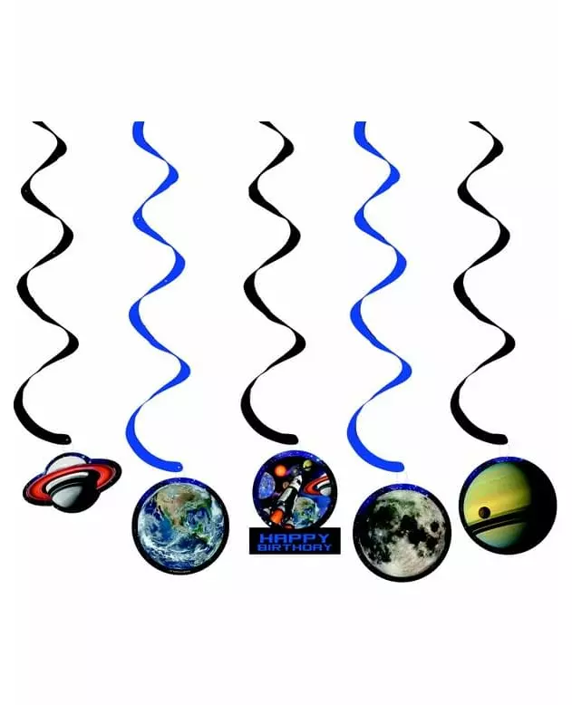 5 hengende bursdagspynt i verdensrommet 91 cm Heng planetene til en bursdag i verdensrommet. Disse 5 dekorasjonene er til å henge opp.