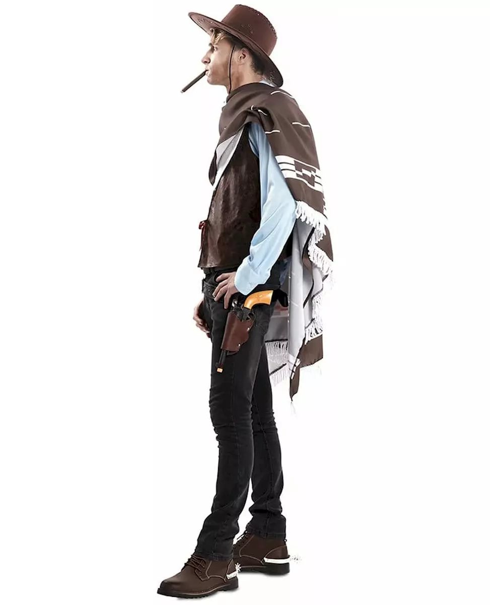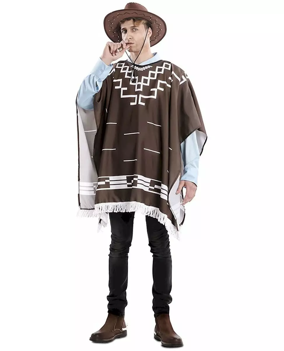 En ekte western-gangster Dette outlaw cowboy-kostymet for menn inkluderer en vest og en poncho (hatt, belte, våpen, skjorte og bukser er ikke inkludert). Ponchoen er brun med hvite geometriske mønstre og hvite frynser. Den minner om en berømt gangster fra westernfilmer. Vesten er laget av brunt dyreskinnstoff med en hvit krage i saueskinnslignende utseende. Et lite brunt bånd lar deg lukke vesten. Dette western-gangster-kostymet for menn vil være perfekt for en western- eller filmtemafest. Inkludert tilbehør: Vest-poncho Materiale: 100 % polyester Vedlikehold: Håndvask