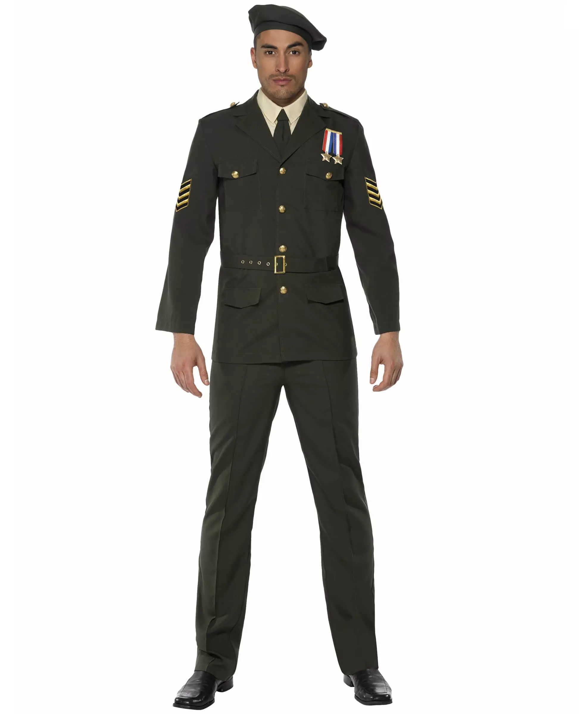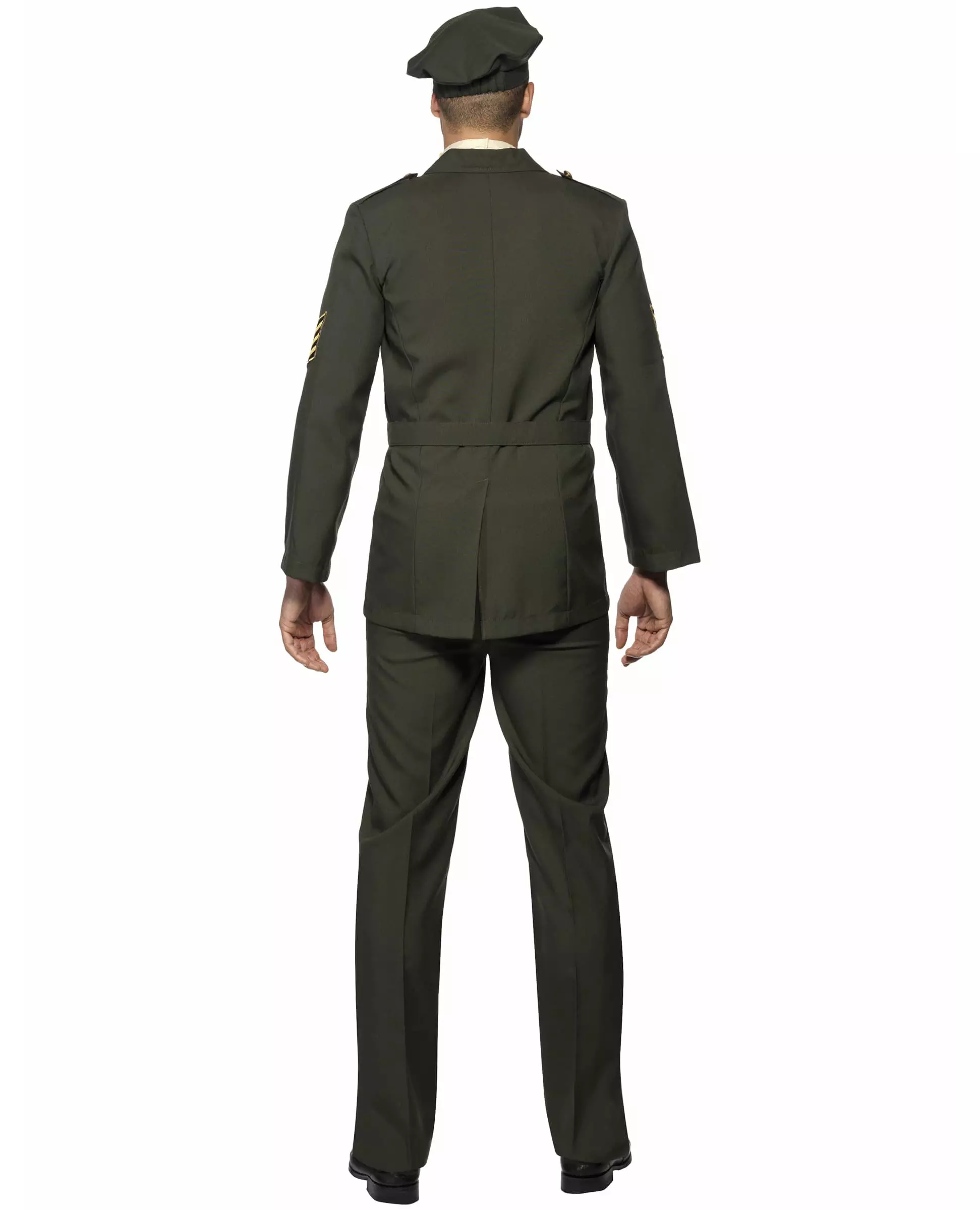 Komplett sett! Dette flotte offiserskostymet for menn inkluderer en jakke med fuskeskjorte, bukser, et belte og en beret (slips ikke inkludert). De mørkegrønne buksene har en lett strikk i livet. De er rettskåret med en legg i midten for å overholde militærforskriftene for klesdrakt. Den mørkegrønne jakken er godt laget og har attraktiv gullkant. Et matchende belte er også inkludert for å stramme inn livet. En matchende beret til uniformen fullfører antrekket ditt. Dette militærkostymet i seremoniell drakt er ideelt for uniformtema-utkledningsfester. Inkludert tilbehør: Jakke Belte Bukser Beret Materiale: 100 % polyester Vedlikehold: Håndvask