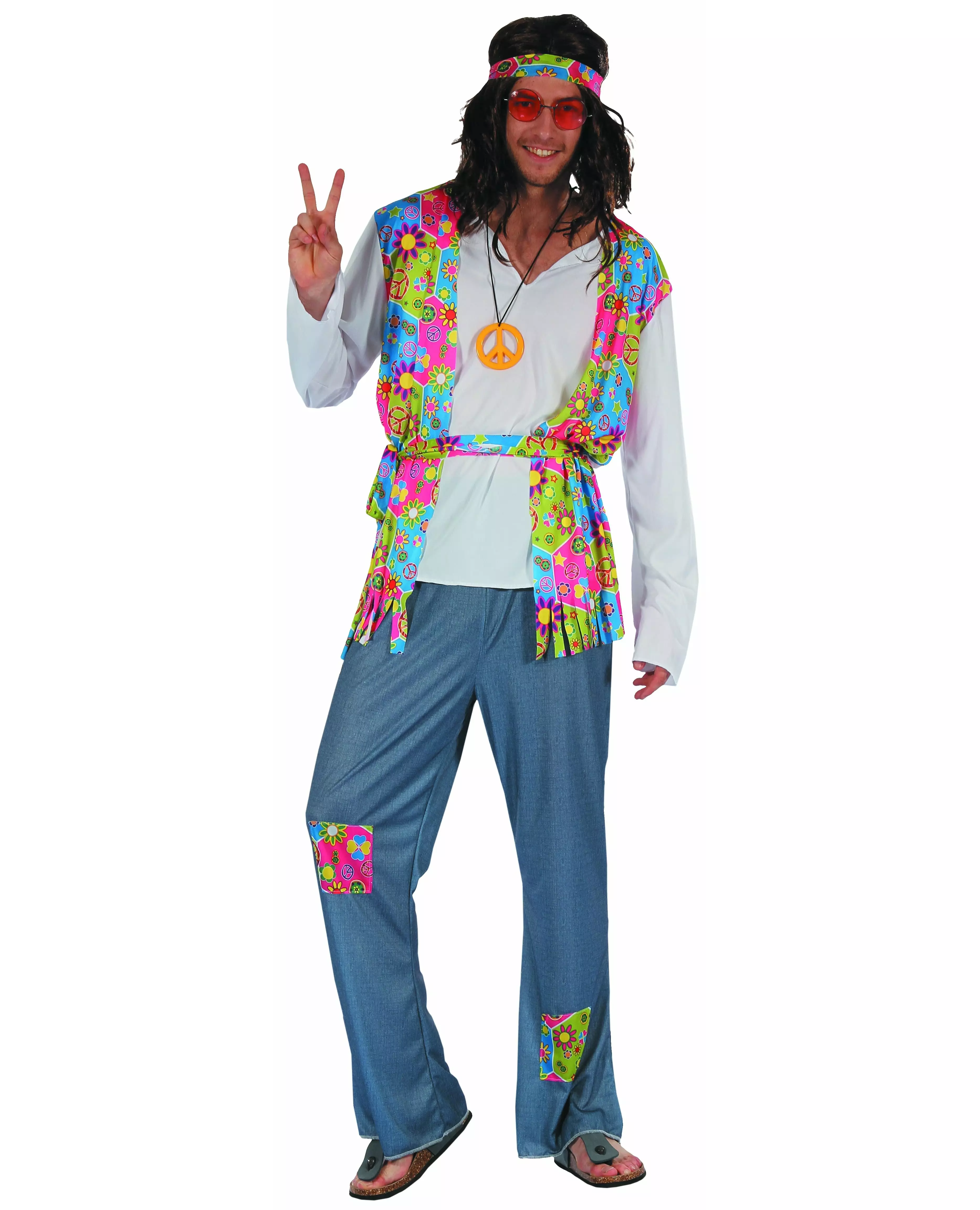 Blomsterstil i håret!! Dette kostymet for voksne minner om antrekket til en 60-tallshippie. Det inkluderer en T-skjorte med jakke, bukser, belte, pannebånd og medaljong (parykk ikke inkludert). Den tynne T-skjorten er hvit. En flerfarget jakke er sydd på T-skjorten. Blomstermønstre og forskjellige symboler er tegnet. Beltet matcher jakken. Buksene er blå. Stoffkvadrater som matcher jakken er sydd på bestemte steder på bena. Et blomsterpannebånd, typisk for 60-tallsbevegelsen, vil fullføre dette kostymet. Det måler 124 x 5 cm. For å perfeksjonere stilen vil en medaljong med en diameter på 8 cm som representerer symbolet for fred og kjærlighet, bli båret rundt halsen på en svart snor. Du er invitert til en temafest, kle deg ut og oppfør deg som en hippie. Inkludert tilbehør: T-skjorte med jakke Bukser Belte Pannebånd Medaljong Materiale: 100 % polyester Vedlikehold: Håndvask