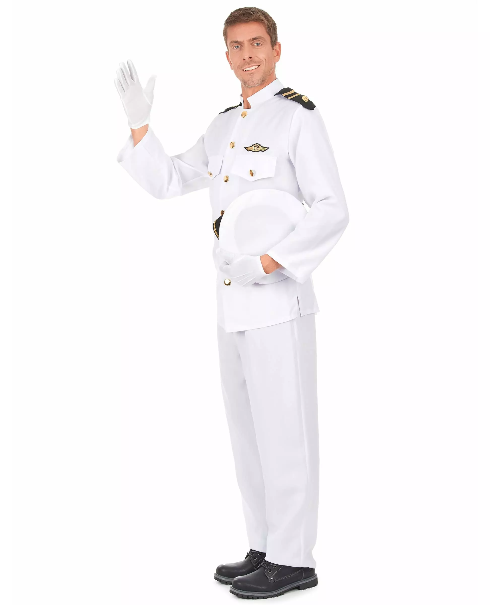 Stå vakt! Dette marineoffiserkostymet inkluderer en jakke, bukser, hansker og en lue. Uniformen er laget av tykt hvitt stoff som festes med gullknapper. Overkroppen er dekorert med et marinemerke, og flette er sydd til skuldrene. De hvite buksene har en elastisk linning. Luen er laget av det samme hvite stoffet som resten av kostymet. Visiret er laget av skum og holder seg lett på plass. En bøyle vil fungere som en ramme. Til slutt vil de tynne hvite hanskene fullføre dette svært stilige kostymet. Du vil garantert bli forvekslet med en ekte marineoffiser i dette kostymet til karneval eller en utkledningsfest! Inkludert tilbehør: Jakke Bukser Lue 2 Hansker Materiale: 100 % polyester Vedlikehold: Håndvask