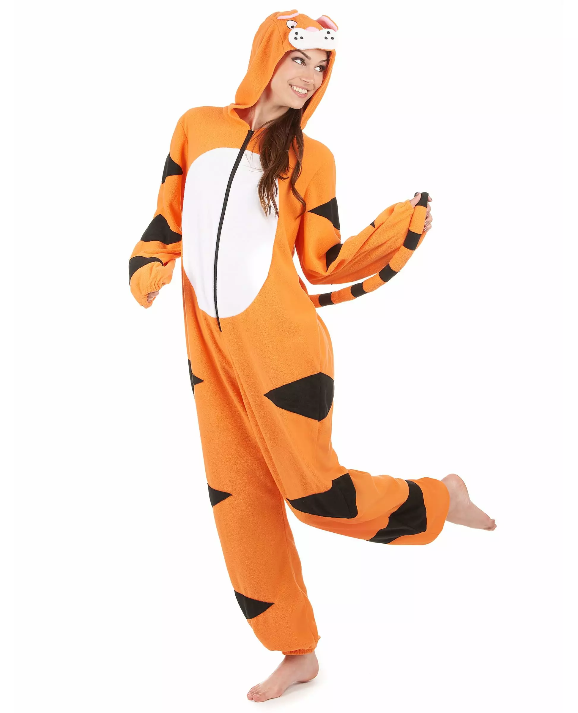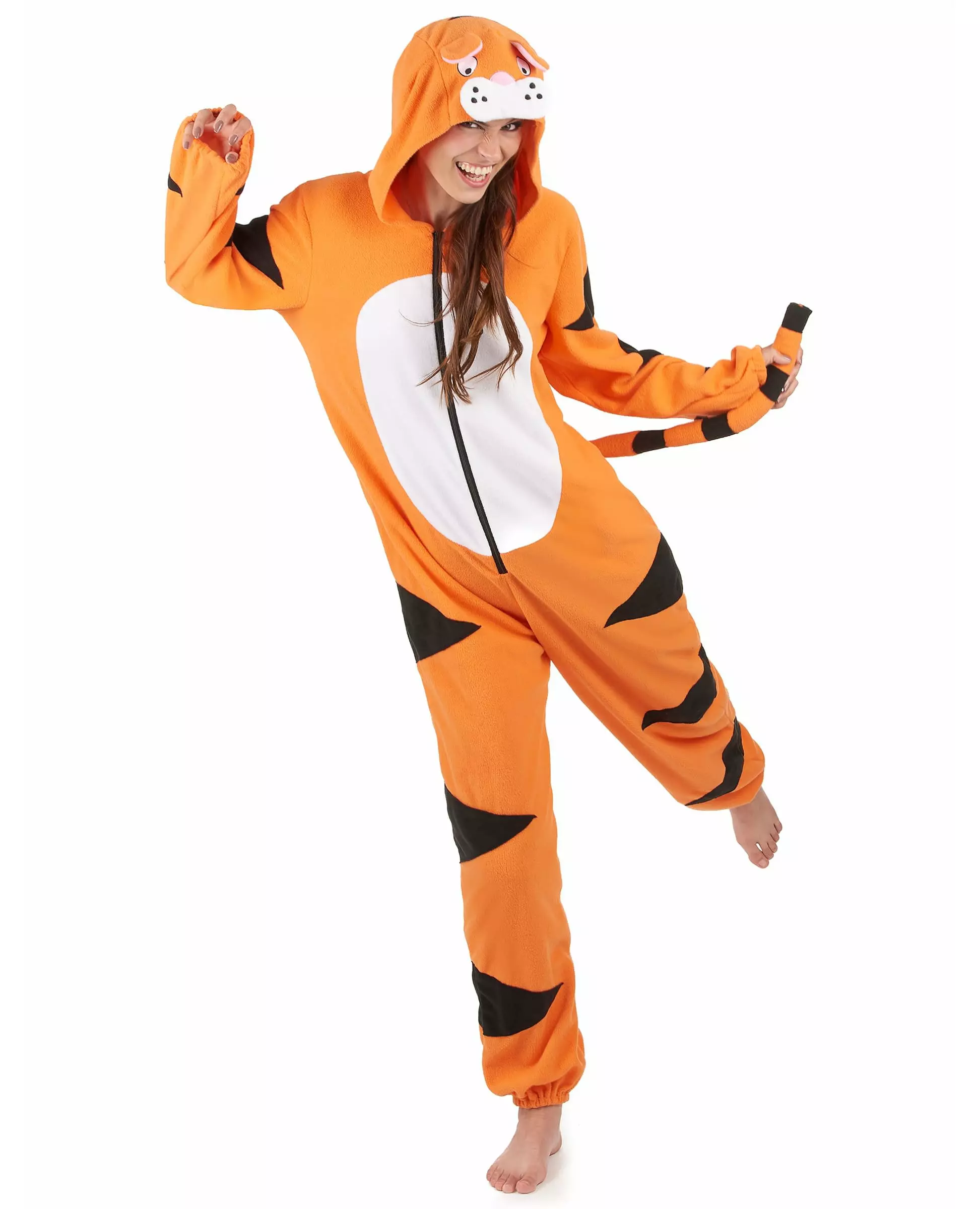 Hurra!!! Denne fleece-tigerjumpsuiten er for kvinner. Ermene og bena er lange og har strikk. Antrekket har glidelås. Den er for det meste oransje med svarte striper og en hvit mage. Hetten viser et par ører og en kattemunn. Halen er sydd på ryggen for å perfeksjonere denne jumpsuiten som vil gjøre deg til den bedårende tigressen i kostymefesten. Inkludert tilbehør: Jumpsuit Materiale: Polyester Stell: Håndvaskbar