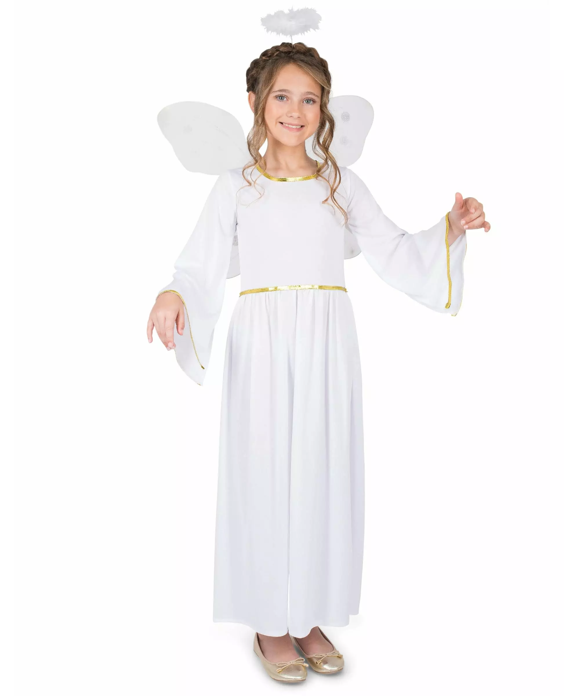 En ekte liten engel! Dette englekostymet består av en kjole, vinger og et pannebånd (ballerinaer er ikke inkludert). Den lange kjolen er hvit og har gulldetaljer på kragen, midjen og ermene. Englevingene er hvite. Pannebåndet har en pen hvit glorie laget av syntetiske fjær. Dette settet for jenter vil være ideelt for å være en fantastisk liten engel under et show eller på karnevalet! Inkludert tilbehør: Kjole Vinger Pannebånd Materiale: 100 % polyester Vedlikehold: Håndvask