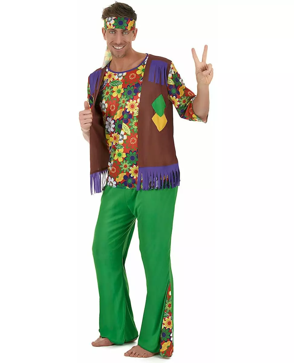 Få hippie-holdningen! Dette hippiekostymet for voksne inkluderer en t-skjorte, bukser og et pannebånd. T-skjorten har korte ermer og er trykt med flerfargede blomster kun på forsiden. En brun vest med lilla frynser er sydd på forsiden. Baksiden er ensfarget brun. Buksene er laget av mykt grønt stoff og har en elastisk linning. Nederdelen er utsvingt og sydd med trekantede innlegg i samme mønster som toppen. Til slutt fullfører pannebåndet, laget av mykt stoff, antrekket perfekt og kan enkelt knytes rundt hodet. Dette kostymet vil være det fargerike settet til en kostymefest med temaet 60-/70-tall for eksempel! Vekk blomsterkraften i deg!. Inkludert tilbehør: T-skjorte Bukser Pannebånd Materiale: 100 % polyester Vedlikehold: Håndvaskbar