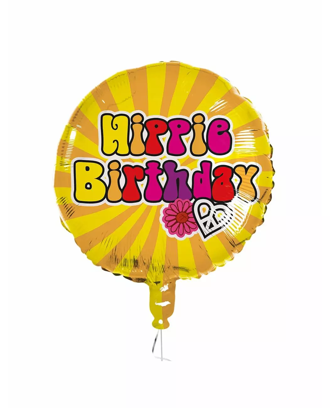 Hippiebursdag! Denne folieballongen måler omtrent 45 cm i diameter. På ballongen finner du inskripsjonen «Hippie bursdag» og hippiesymboler på gul bakgrunn. Du kan blåse den opp med luft, et sugerør eller helium. Denne ballongen vil være perfekt for å dekorere rommet ditt med et hippietema til bursdagen din! Materiale: Folie. Tilbehør inkludert - 1 ballong.
