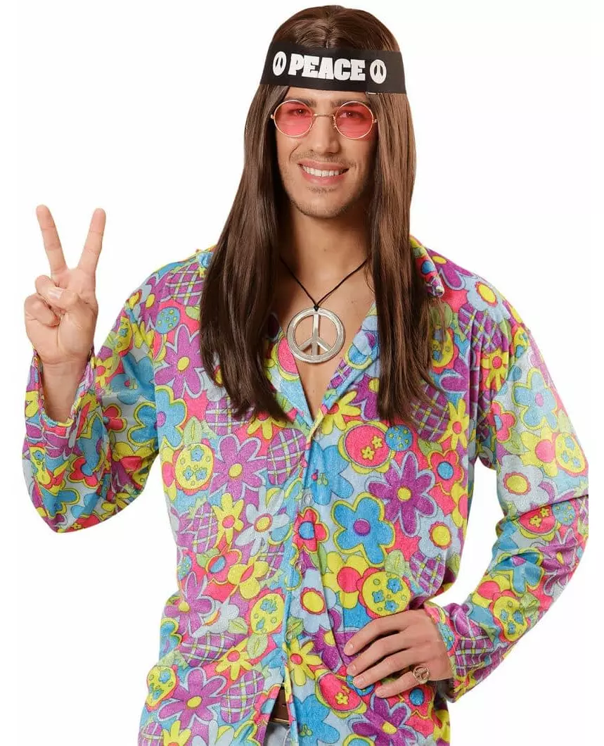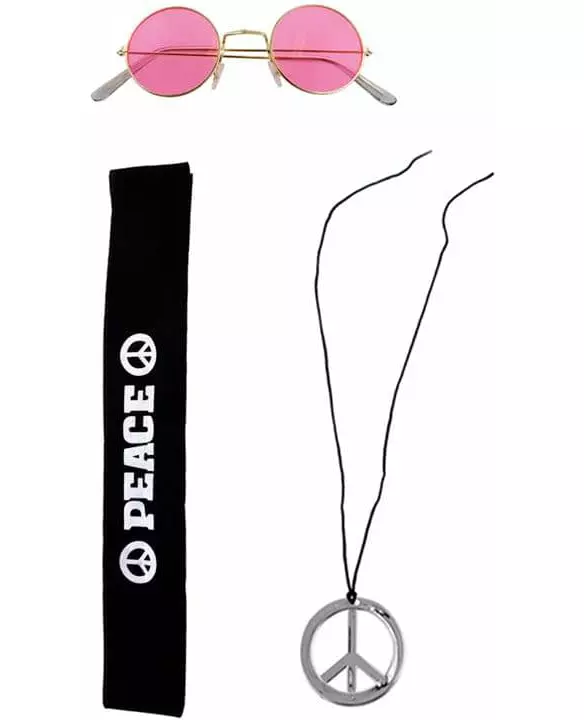 Ta en reise tilbake til Woodstock-æraen. Dette hippiesettet består av et pannebånd, et halskjede og et par briller (parykk og skjorte er ikke inkludert). Pannebåndet er svart og er trykket med ordet «fred» samt det berømte hippie-motivet «fred og kjærlighet». Sølvkjedet har samme motiv. De runde rosa brillene med gullkant fullfører settet. Dette settet vil være perfekt for å fullføre hippiekostymet ditt til en 60-tallsfest eller til karneval. Inkludert tilbehør: Halskjede Pannebånd Briller Materiale: Pannebånd 100 % polyester Pannebånd 100 % polyester