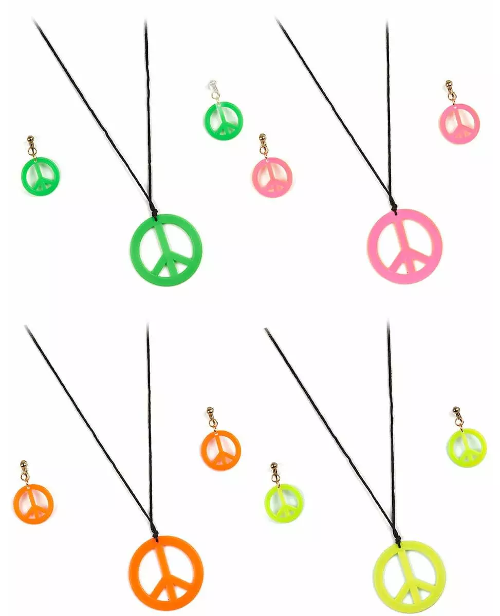 Øredobber og matchende halskjede! Dette hippie-settet består av et par klips-øredobber og et matchende halskjede som representerer symbolet for fred og kjærlighet. Modellen sendes tilfeldig. Dette tilbehøret vil være perfekt for å fullføre hippie-kostymet ditt under temafester med venner. «Copyright Widmann SRL». «Copyright Widmann SRL. Inkludert tilbehør: Øredobber Halskjede Materiale: plast
