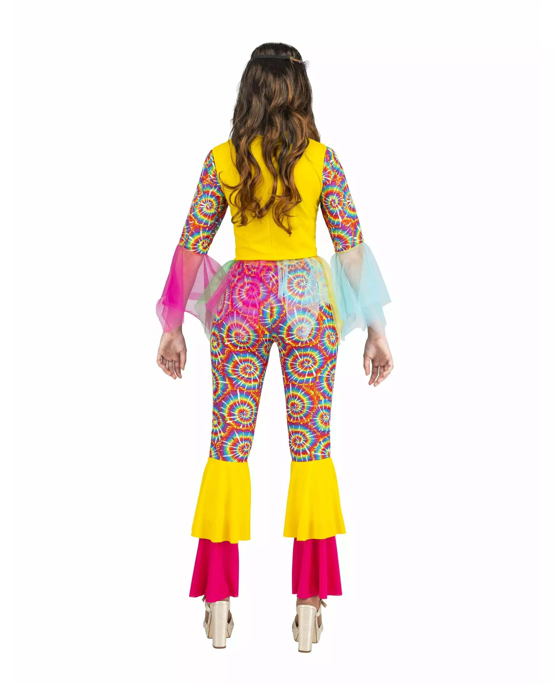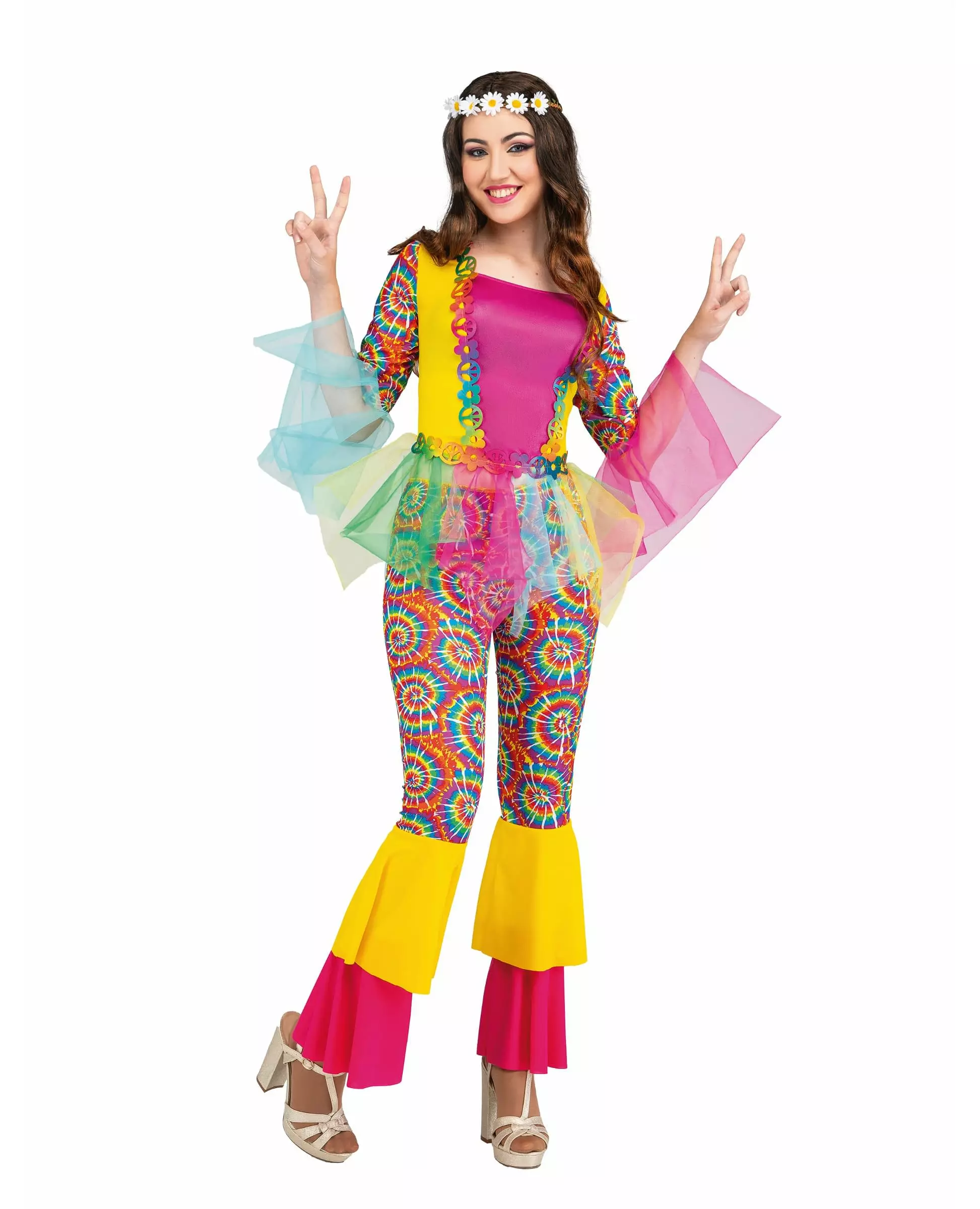 Se livet i farger i dette hippiekostymet. Dette hippiekostymet for jenter består av en topp og bukser (pannebånd og sko er ikke inkludert). Ved bysten er toppen gul og rosa. Den har ermer med flerfargede psykedeliske mønstre. Nederdelen av ermene og toppen er dekorert med slør i regnbuens farger. Fargerike kanter som representerer freds- og kjærlighetstegn, og fargerike blomster gir antrekket et snev av detaljer. Buksene er flerfargede med et psykedelisk mønster. Nederdelen av bena er laget av gule og rosa rysjer. Dette kostymet vil være perfekt for å leke freds- og kjærlighetshippier under karnevalet. Inkludert tilbehør: Topp Bukser Materiale: 100 % polyester Vedlikehold: Håndvask