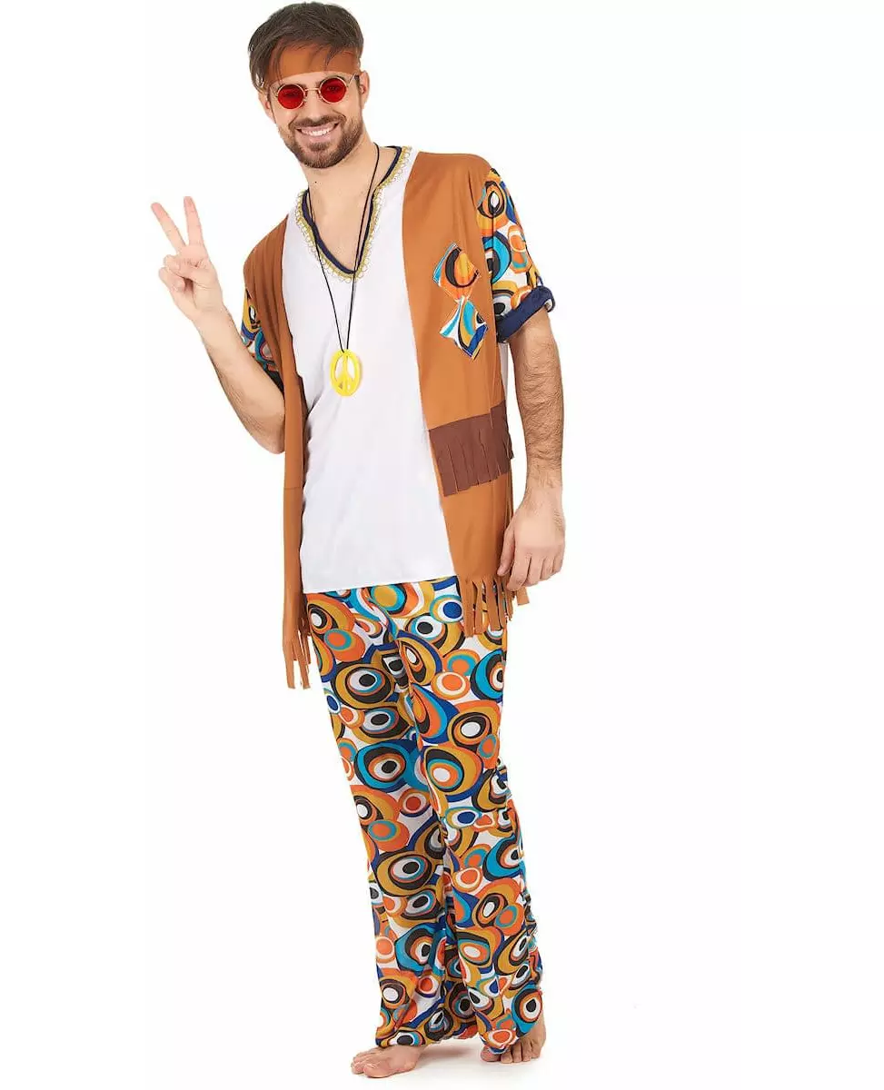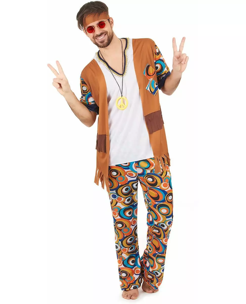 Grow a Beard Dette kostymet for voksne forestiller en hippie. Det inkluderer en T-skjorte med vest, bukser, pannebånd og et halskjede (briller ikke inkludert). T-skjorten er hvit med svart V-hals og gullbroderi. Den er dekket av en brun kortermet vest. Det er to rader med lysebrune og mørkebrune frynser foran på vesten. Ermene matcher buksene. Baksiden er ensfarget hvit. Polyesterbuksene er rette og har elastikk i livet. De er typisk i 60-tallsstil med psykedeliske mønstre. Pannebåndet er brunt som vesten. Plastanhenget «Fred og kjærlighet» bæres på en 55 cm svart snor og måler 8 cm i diameter. Ved å legge til en parykk med langt hår, blir du helt kul på en temafest. Inkludert tilbehør: T-skjorte og jakke Bukser Pannebånd Halskjede Materiale: 100 % polyester Vedlikehold: Håndvask Målinformasjon: For størrelse L, topp 75 cm lang og bukser 111 cm lang omtrent