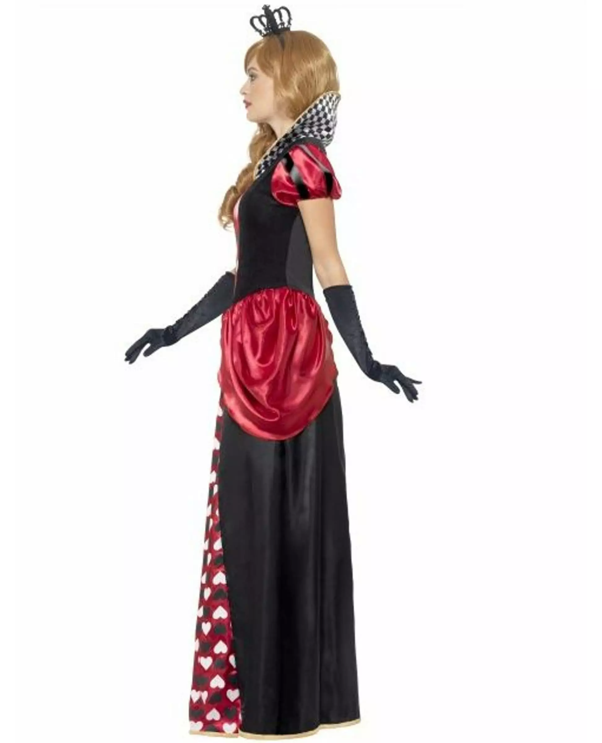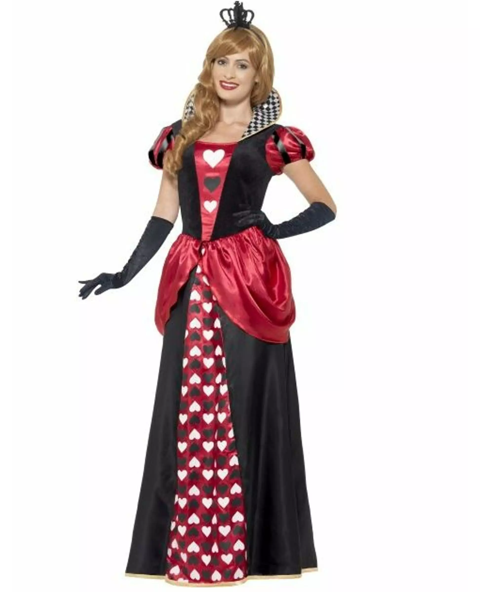 Mal rosene dine røde! Dette hjerterdronning-kostymet for kvinner består av en lang kjole og et pannebånd. Den øvre delen av kjolen er laget av fløyelseffektstoff, mens den nedre delen er laget av satengstoff. Svarte og hvite hjerter pryder fronten på en satengrød bakgrunn. De korte ermene i rødt og svart satengstoff er puffede. Den svart-hvite rutete kragen er laget av skum for å holde den rett. Et rødt satengstoff er på sidene av kjolen for å skape den puffede effekten. Kjolen lukkes bak med glidelås. Det svarte plastpannebåndet er toppet med en svart filtkrone. Dette kostymet vil være ideelt for å legemliggjøre en hjerterdronning til karneval eller en kostymefest! Tilbehør inkludert - Kjole - Pannebånd
