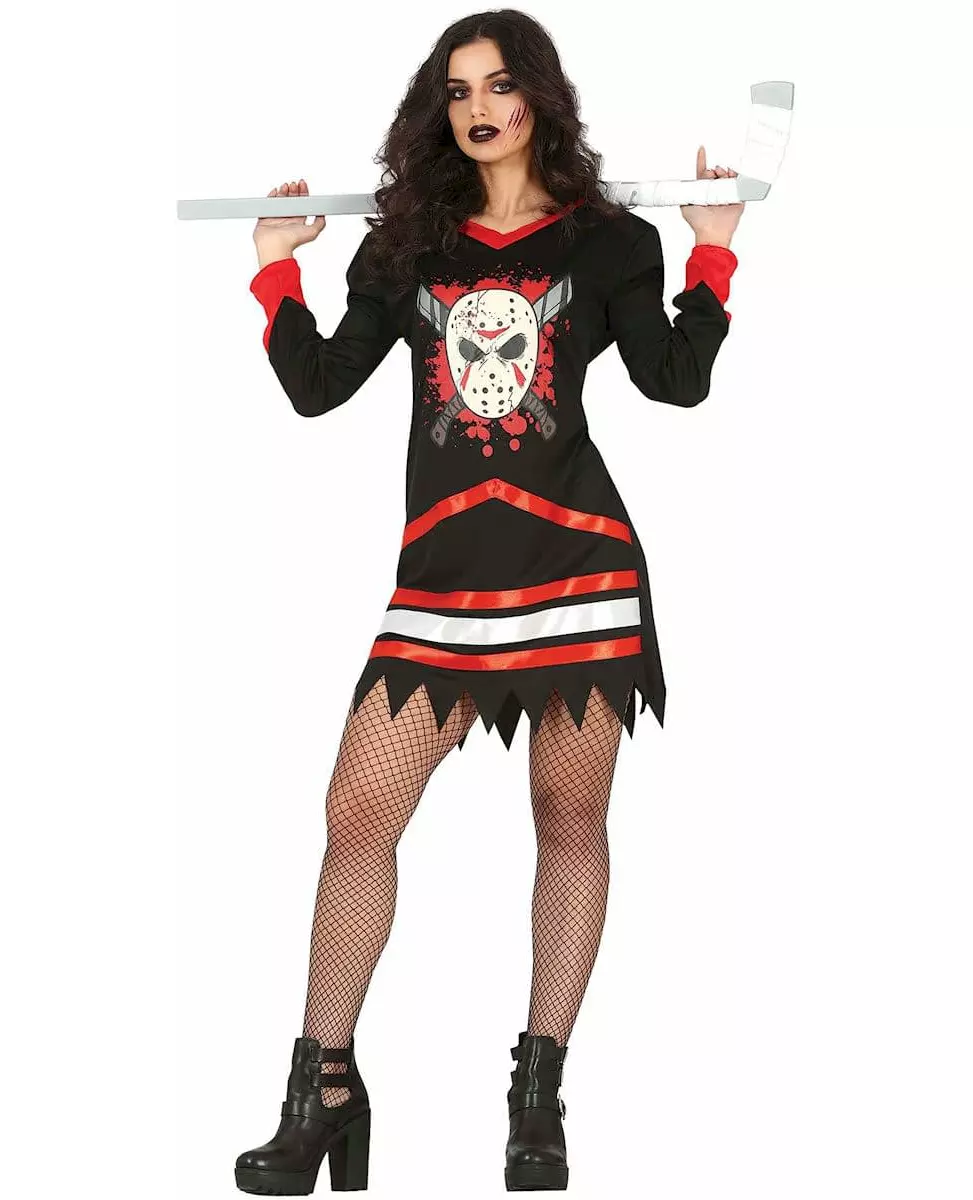 Spill som en berømt morder denne Halloween! Dette hockey-snikmorderkostymet er for kvinner og består av en kjole. Den langermede, svarte kjolen er dekorert med et trykk av den berømte hockeymasken, sprutet med blod for en enda mer slående effekt. Kragen og mansjettene på kjolen er fremhevet i rødt, noe som gir et uhyggelig og stilig preg til antrekket ditt. Nederdelen av kjolen har en taggete effekt som gir et revet utseende og er dekorert med røde og hvite striper. Med dette hockey-snikmorderkostymet vil du legemliggjøre den perfekte blandingen av forførelse og terror, klar til å hjemsøke den neste Halloween-festen. !. Inkludert tilbehør: 1 kjole Materiale: 100 % polyester Pleie: Håndvask