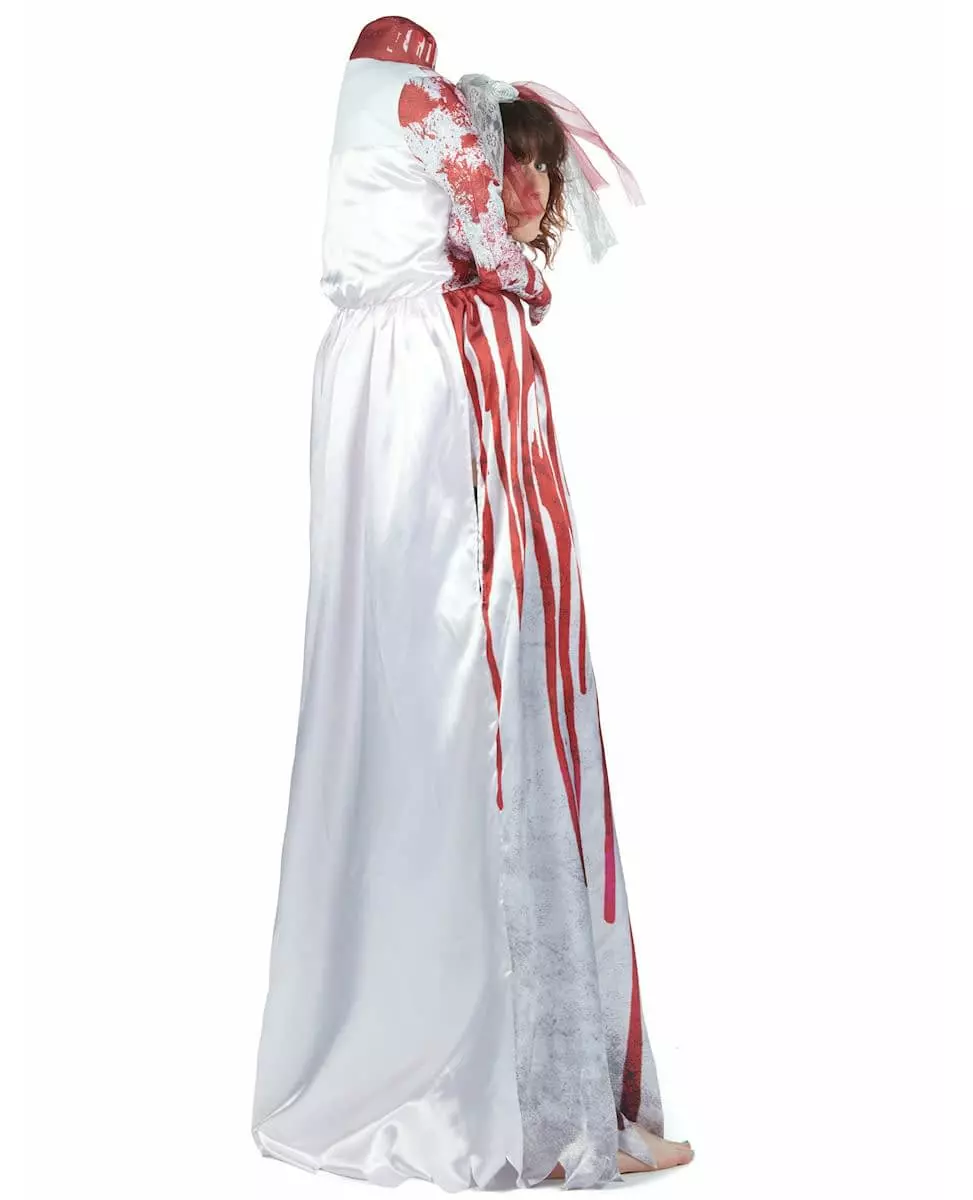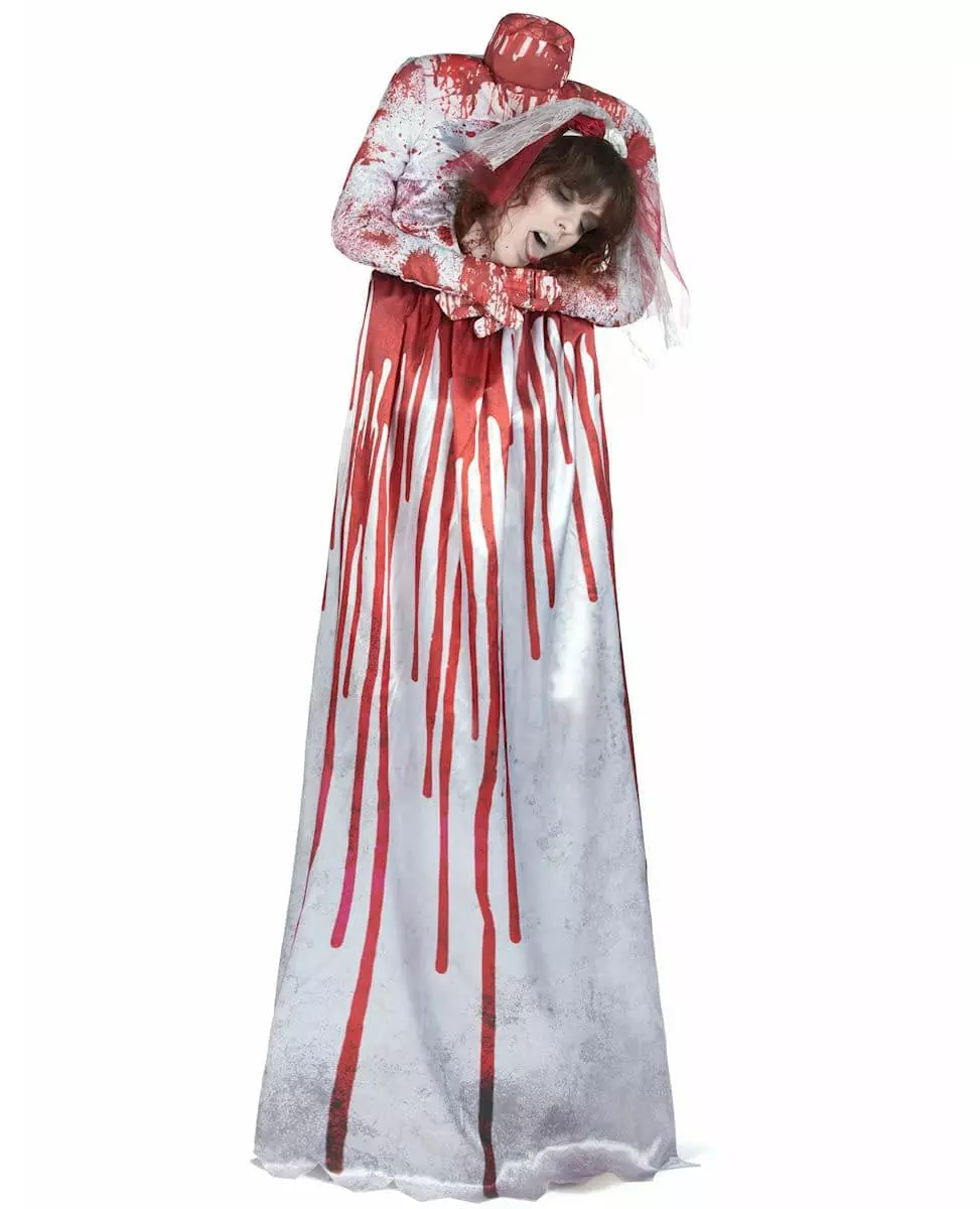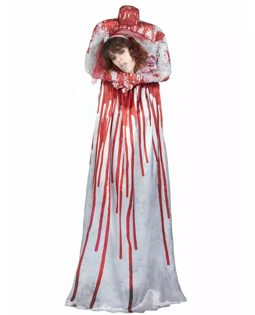 Ja, det gjør jeg....! Dette hodeløse brudekostymet er for kvinner. Det inkluderer en kjole og et hodeplagg. Brudekjolen er polstret på toppen og har en hodeåpning ved bysten. Det er også armåpninger på sidene av skjørtet. Den polstrede toppen representerer en hodeløs hals for en ekte avhugget hodeeffekt. Armene vil omgi hodet ditt for å gi en kvelningseffekt. Kjolen er dekket av falske blodflekker som går gjennom hele kostymet for å skape en enda mer skremmende effekt. Hodeplagg er laget av blonder og dekorert med røde og hvite roser. Har du ikke bestemt deg for Halloween-kostyme ennå? Dette hodeløse brudekostymet vil gjøre susen! Det vil være perfekt for å terrorisere vennene dine eller kjæresten din på en Halloween-fest!. Inkludert tilbehør: Kjole Hodeplagg Materiale: 100 % polyester Pleie: Håndvask