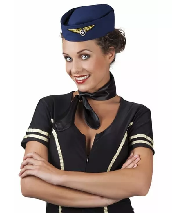 En ekte flyvertinne! Denne marineblå flyvertinnehatten er dekorert med en logo som representerer en hvit stjerne omgitt av to gule vinger. Dette tilbehøret vil være ideelt for å fullføre flyvertinnekostymet ditt under et karneval eller en kostymefest. Inkludert tilbehør: 1 hatt Materiale: 100 % polyester