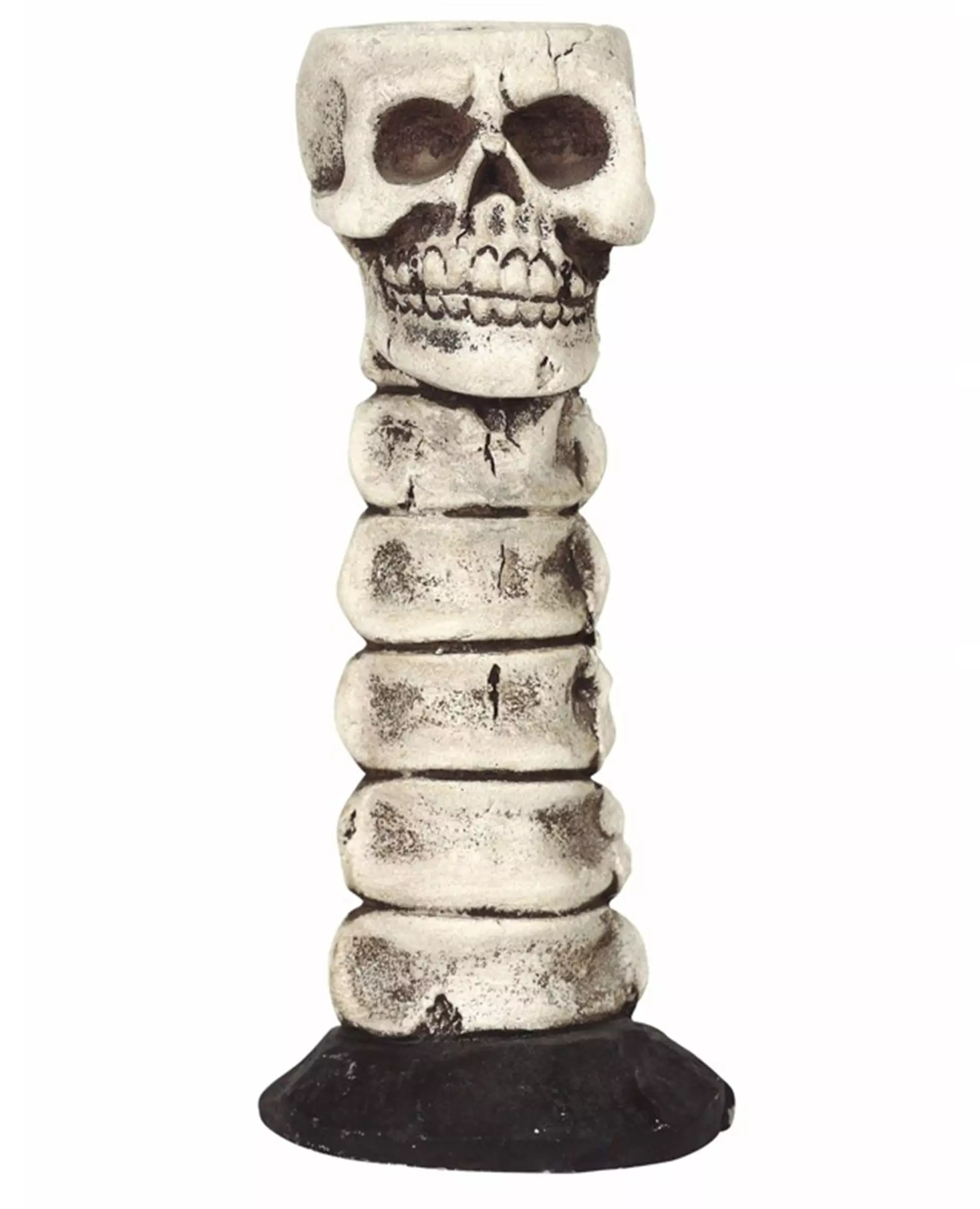 Lys opp hjemmet ditt med en morbid atmosfære med denne hodeskalle-lysestaken! Denne hodeskalle-lysestaken måler omtrent 17 cm. Lysestaken forestiller en ryggrad med en menneskeskalle som topp på denne dekorasjonen. Plasser denne hodeskalle-lysestaken med et rødt lys midt på bordløperen din under Halloween-måltidet. Inkludert tilbehør: 1 lysestake
