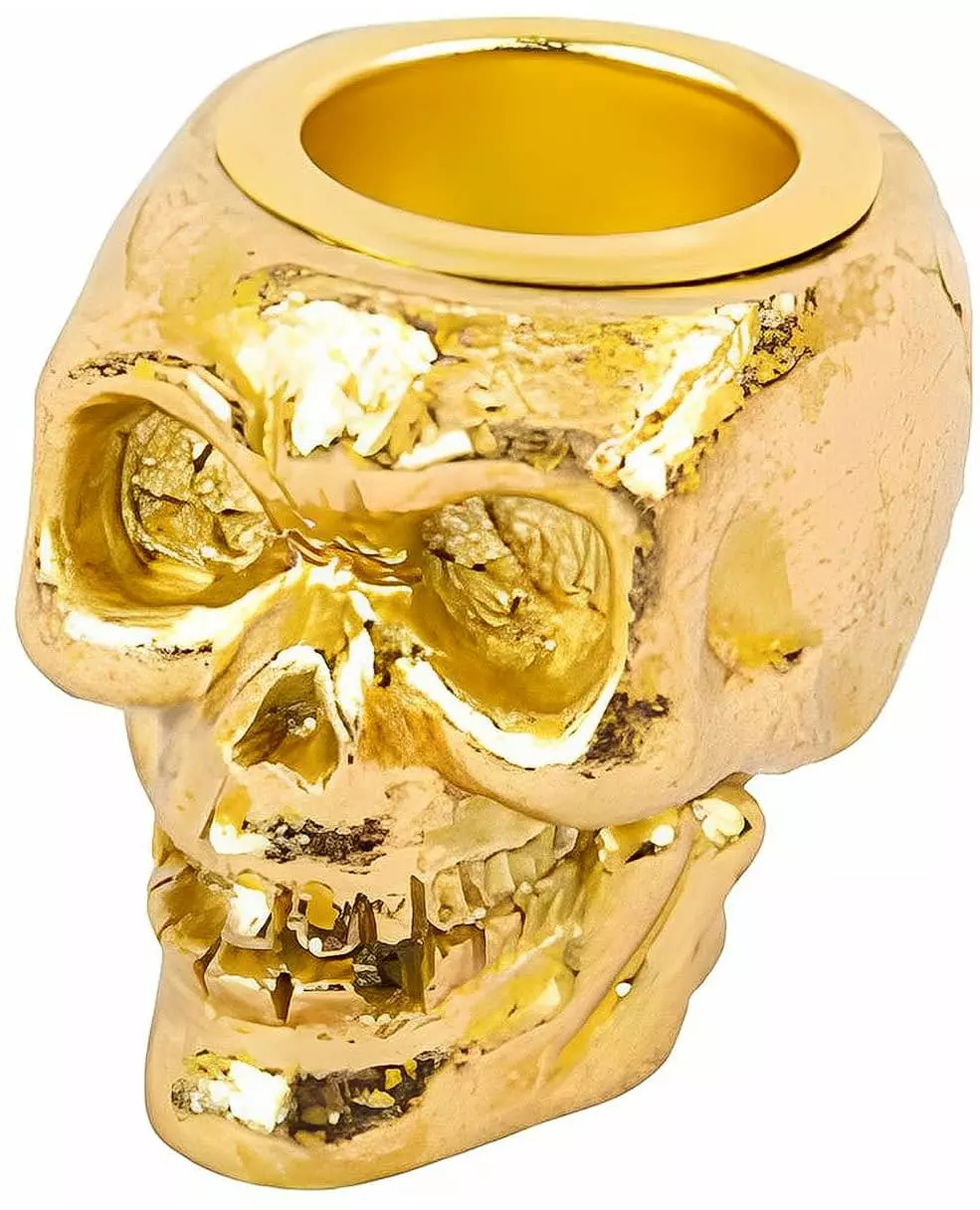 En strålende skinnende hodeskalle! Denne hodeskalle-lysestaken måler omtrent 4 x 4 cm. Laget av harpiks, har den utseendet til en hodeskalle med en gyllen farge overalt. Du kan enkelt plassere lyset ditt inni den. Fullfør innendørs- eller utendørsdekorasjonen din til Halloween-festen din! Inkludert tilbehør: 1 lysholder Materiale: Plast