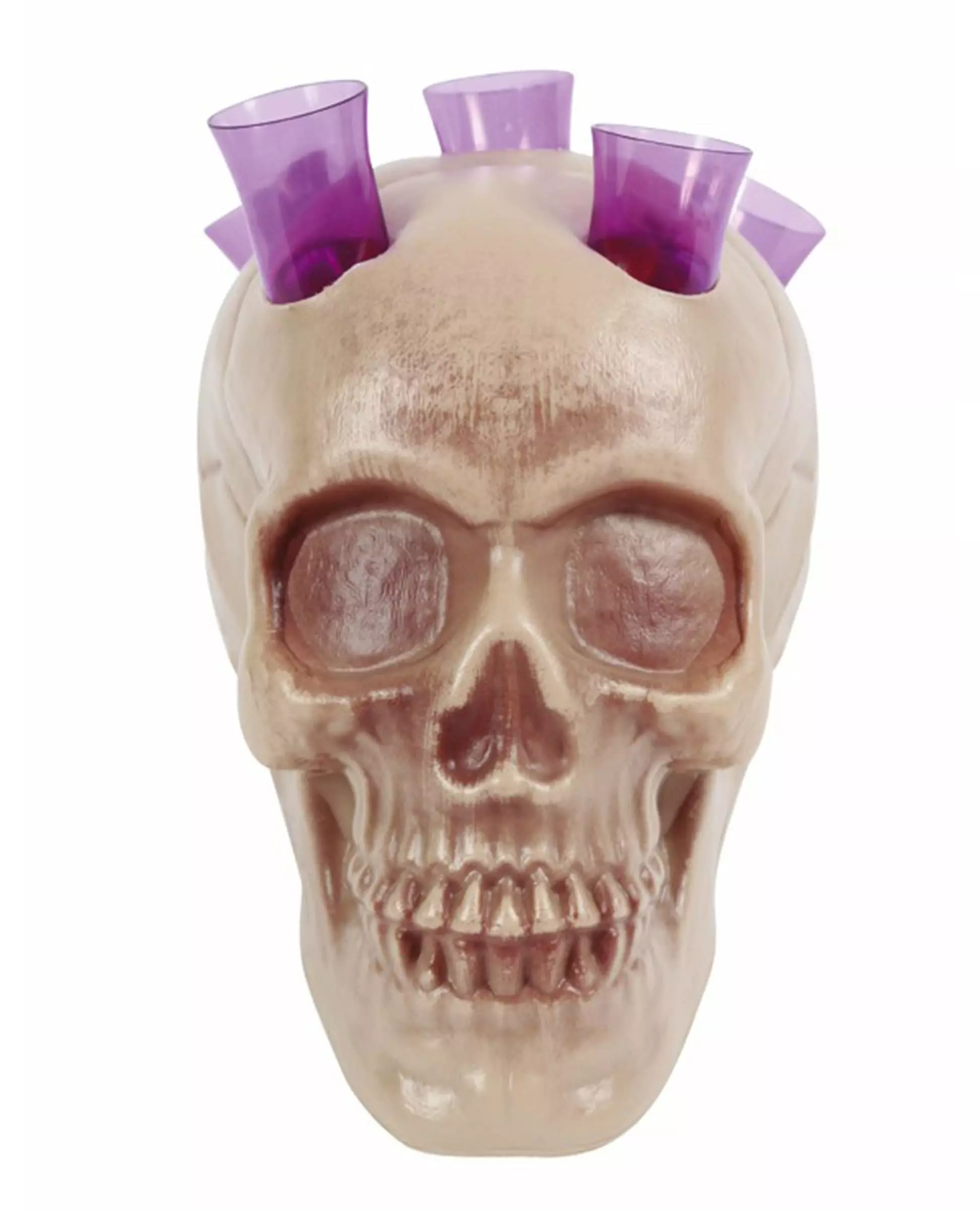 Den beste måten å drikke shots på! Denne shotglassholderen måler omtrent 20 cm. Hodeskallen er grå og beige med 5 hull på bunnen av hodeskallen for å oppbevare shots. Denne shotglassholderen vil være din allierte for en kveld med drikkeleker på Halloween-festen din! (Alkohol skal konsumeres med måte.) Inkludert tilbehør: Hodeskalle