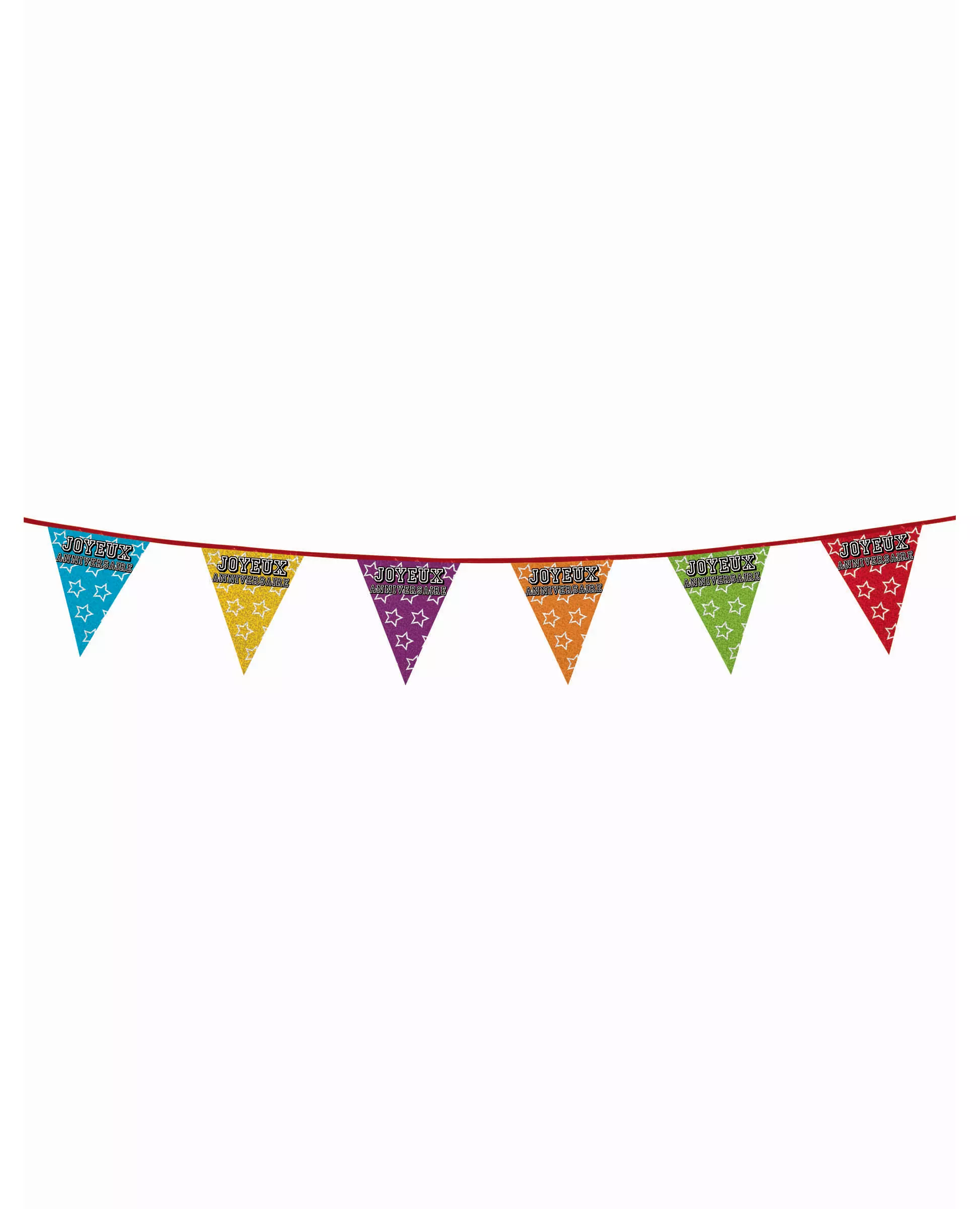 For en flott bursdagsdekorasjon! Denne bursdagsgirlanderen måler omtrent 8 meter lang. Den er laget av aluminium og består av 16 holografiske vimpler. Hver vimpel måler omtrent 29 cm. De er i forskjellige farger og har små skinnende stjerner. Innskriften «Gratulerer med dagen» er trykt i midten i svart og sølv. Et rødt bånd er også tilgjengelig, slik at du enkelt kan henge girlanderen opp. Denne vimpelgirlanderen vil perfekt forbedre dekorasjonen din til en fargerik bursdag. Inkludert tilbehør: Girlander Materiale: Aluminium