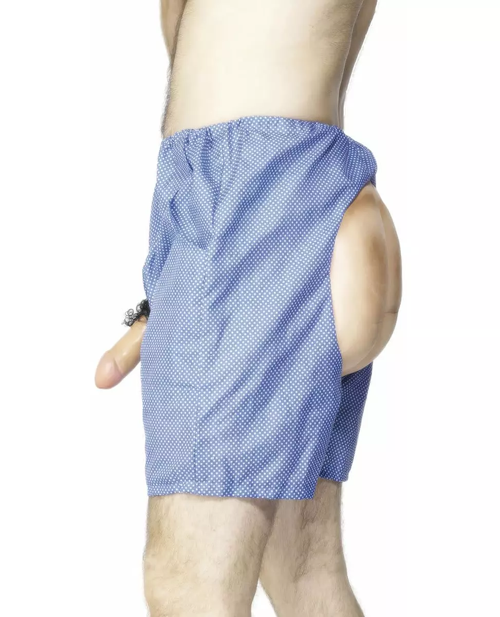 Veldig realistisk! Disse humoristiske voksentrusene består av blå truser med små hvite prikker. Lommer er på sidene. En 15 cm falsk mannlig penis omgitt av kunstig hår kan fjernes når det passer deg fordi en glidelås er sydd fast. Baken er også godt laget av samme materiale som den falske penisen, en myk plast for garantert realisme. Disse trusene er perfekte for å underholde de rundt deg under et kostymefest. Garantert latter!