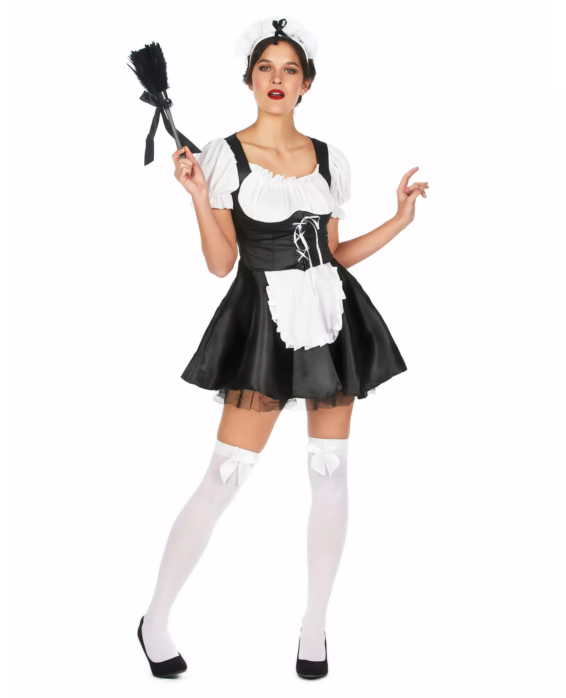 Med underskjørt! Dette kostymet inkluderer en svart og hvit kjole, som en ekte hushjelp, et forkle og en falsk snørevest er sydd på for en mer realistisk effekt. Et underskjørt og et pannebånd med hvit blonder og en svart sløyfe er også inkludert (kostyme, strømper og sko er ikke inkludert). Dette kostymet er ideelt for utkledningsfester med venner. Inkludert tilbehør: Kjoleforkle Underskjørt Pannebånd Materiale: 100 % polyester Stell: For hånd Målinformasjon: For størrelse S er kjolen omtrent 88 cm lang
