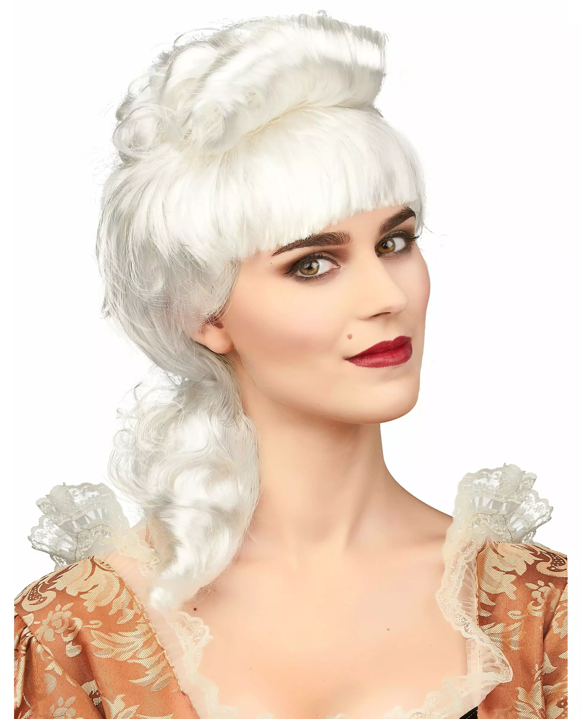 Fullfør grevinnekostymet ditt med denne elegante parykken. Denne edle parykken for kvinner er hvit i fargen. Den har en rett lugg. Håret er rullet på toppen av hodet. En middels lang, bølget hvit hestehale fullfører denne parykken. Dette tilbehøret vil være perfekt for å fullføre et marquisekostyme til en renessansefest. Inkludert tilbehør: Parykkmateriale: Syntetisk 100 % polyester 100 % polyester