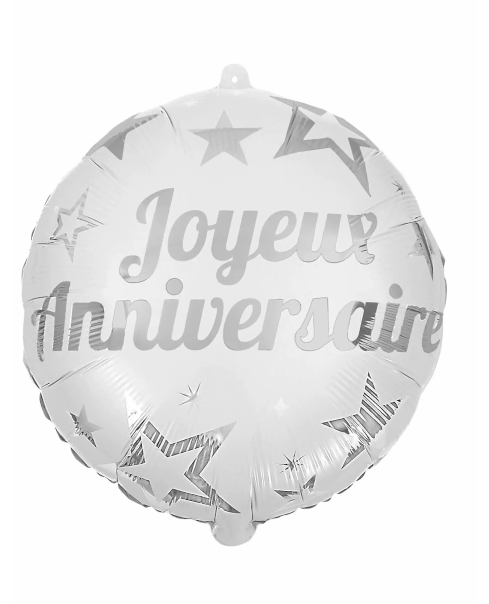 Til en sølvbursdag! Denne 45 cm store bursdagsballongen er laget av aluminium. Den er hvit med «Happy Birthday» skrevet med sølvbokstaver, og sølvstjerner fullfører ballongdekorasjonen. Den kan blåses opp med luft eller helium. Denne ballongen vil være ideell for å dekorere et rom eller en hage til en bursdag!. Inkludert tilbehør: Ballongmateriale: Aluminium