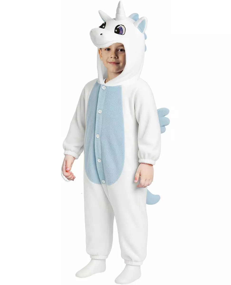 Liten fantasivesen! Dette enhjørningskostymet for barn inkluderer en jumpsuit. Jumpsuiten er hvit med en blå mage. Den har en hette som representerer et enhjørningshode med et hvitt horn og pene blå øyne. En blå hale og vinger dekorerer baksiden av jumpsuiten. Den vil være enkel å ta på takket være hvite knapper plassert foran, pluss at den vil holde barnet ditt varmt. Dette kostymet vil være perfekt for å forvandle barnet ditt til en enhjørning til karneval eller til en utkledd bursdagsfest! Inkludert tilbehør: Jumpsuit med hette Materiale: 100 % polyester Vedlikehold: Håndvask