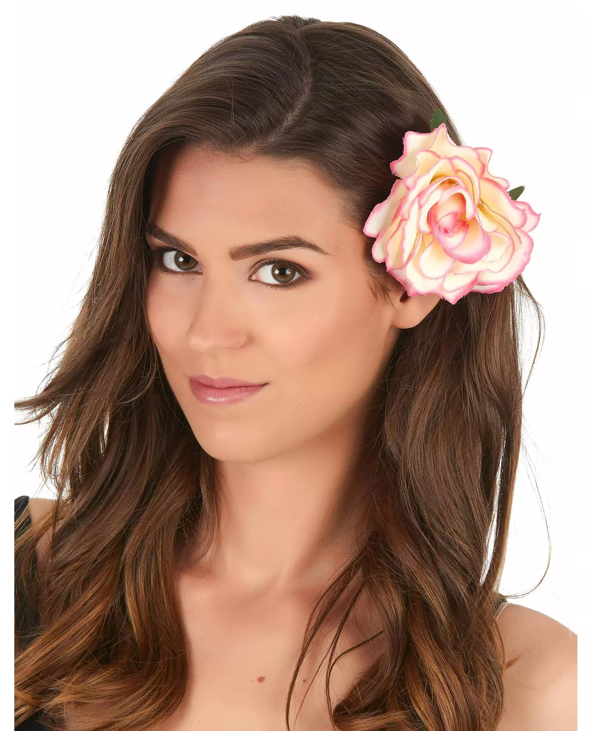 En veldig vakker rose. Denne voluminøse hårspennen har en veldig realistisk roseform. Kronbladene er lysegule i midten, deretter blekrosa og ender med en mørkere rosa kant. Den vil være det essensielle smykket til ditt spanske eller vahine-kostyme til utkledningsfesten din. Inkludert tilbehør: Hårspenne. Materiale: Stoff.