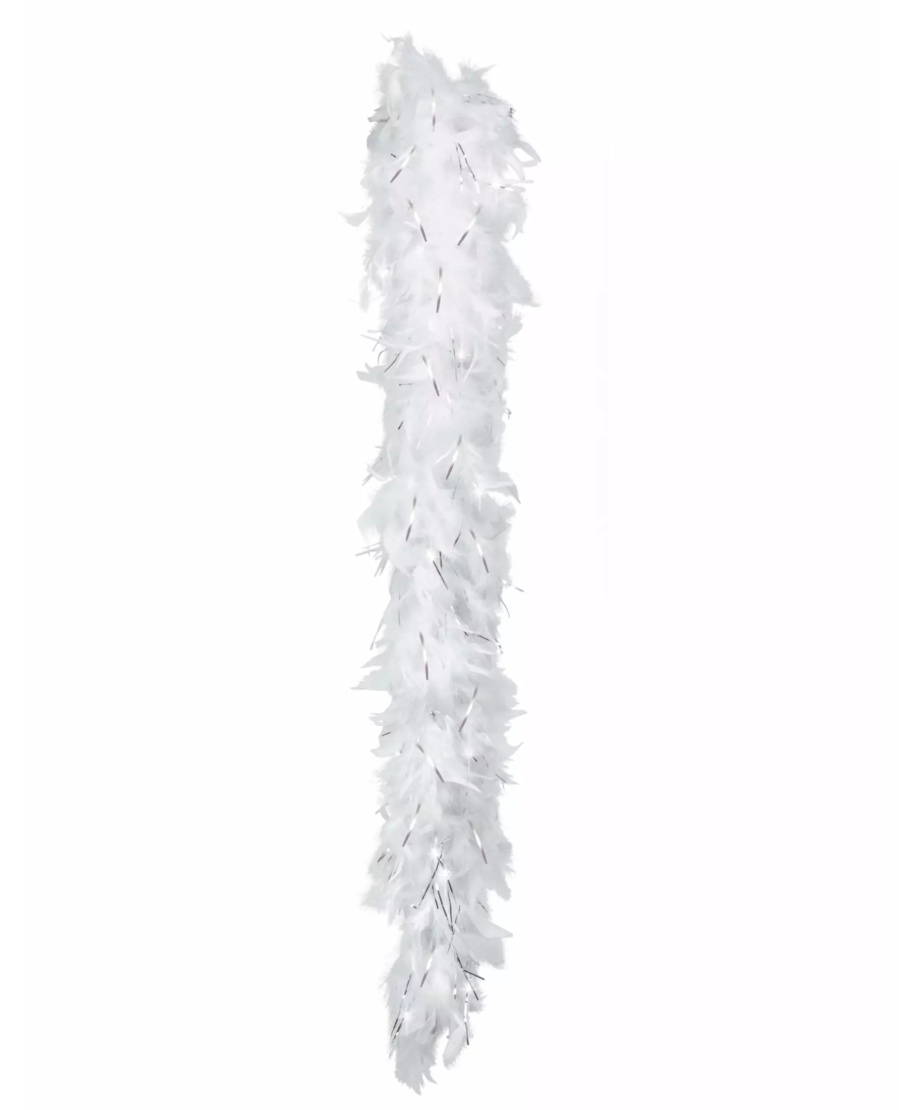 Glamorøs! Denne hvite og sølvfargede boaen er laget av fjær. Den veier 80 gram og måler 1,80 cm. Denne boaen vil være ideell for å fullføre kostymet ditt under kostyme- eller temafester.