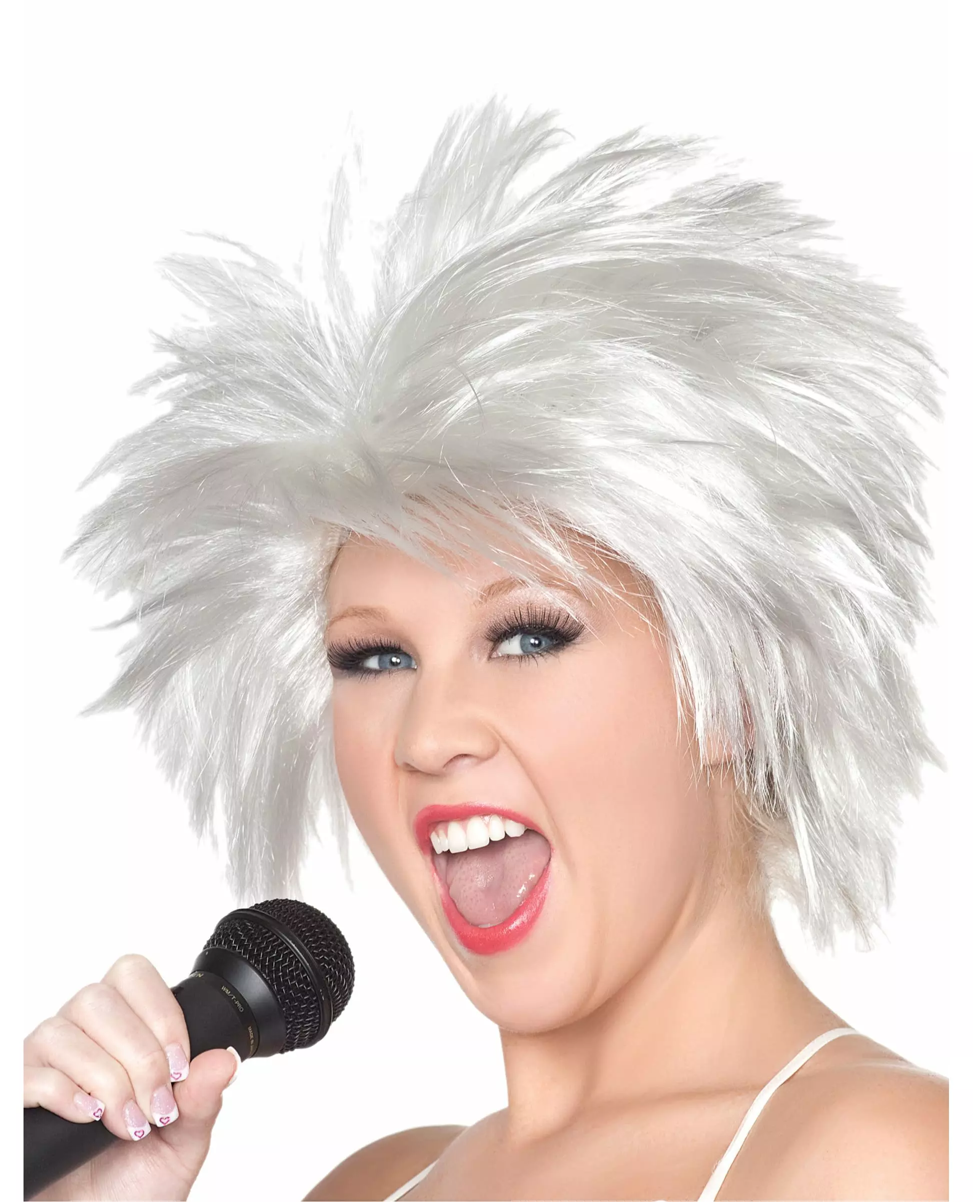 Få et sprøtt utseende! Denne rockestjerneparykken er for kvinner. Den er laget av hvitt syntetisk hår. Sistnevnte er korte og rufsete på toppen for et sprøtt utseende! Den sitter enkelt på hodet takket være et elastisk nett. Denne parykken vil være det essensielle tilbehøret for å fullføre kostymene dine under rock- eller punk-temakvelder. Inkludert tilbehør: Parykk Materiale: Syntetisk 100 % polyester 100 % polyester