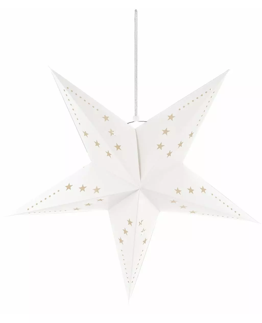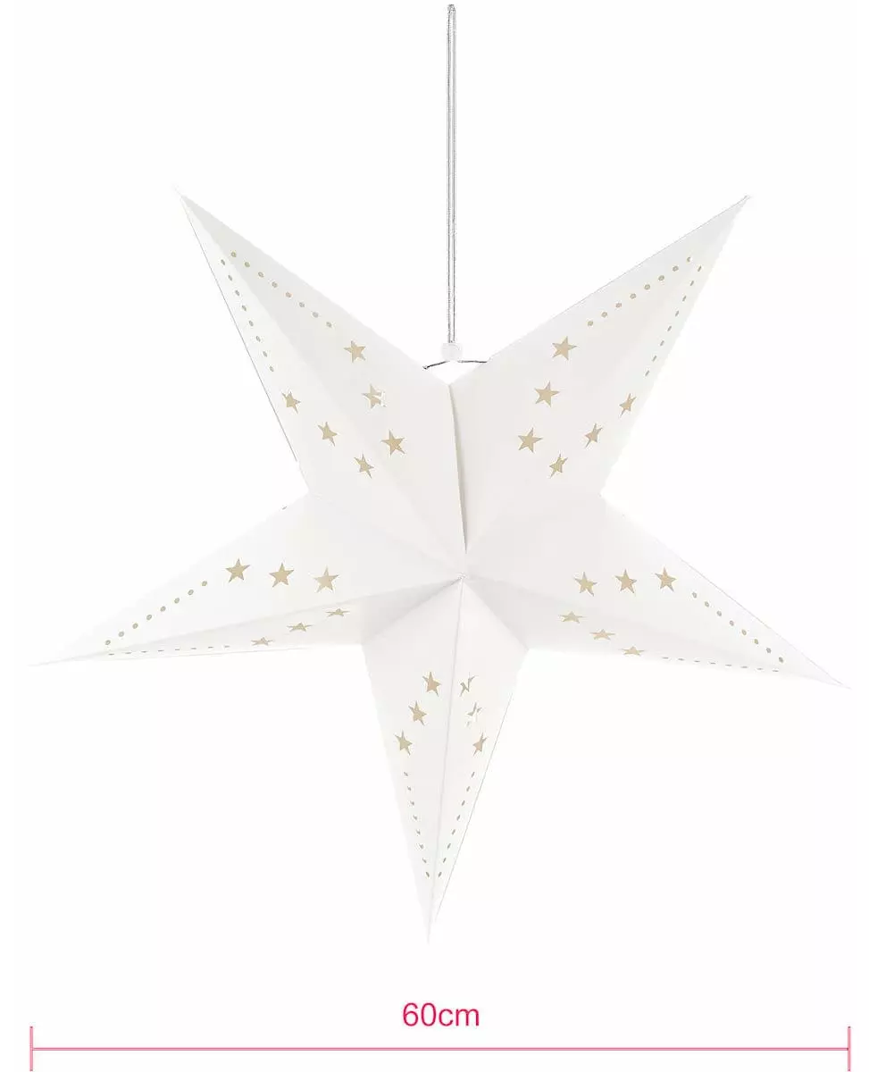 En fin stjernedekorasjon til barnet ditt! Denne pappstjernen er hvit med stjerner stemplet på. Den måler 60 cm i diameter og vil være veldig enkel å brette ut av deg. Faktisk trenger du bare å trekke i sølvsnoren og stramme den for å lage dekorasjonen din. For en dekorasjon med temaet feer eller en babyshower, vil denne vakre stjernen være perfekt! Inkludert tilbehør: 1 stjerne Materiale: Papp