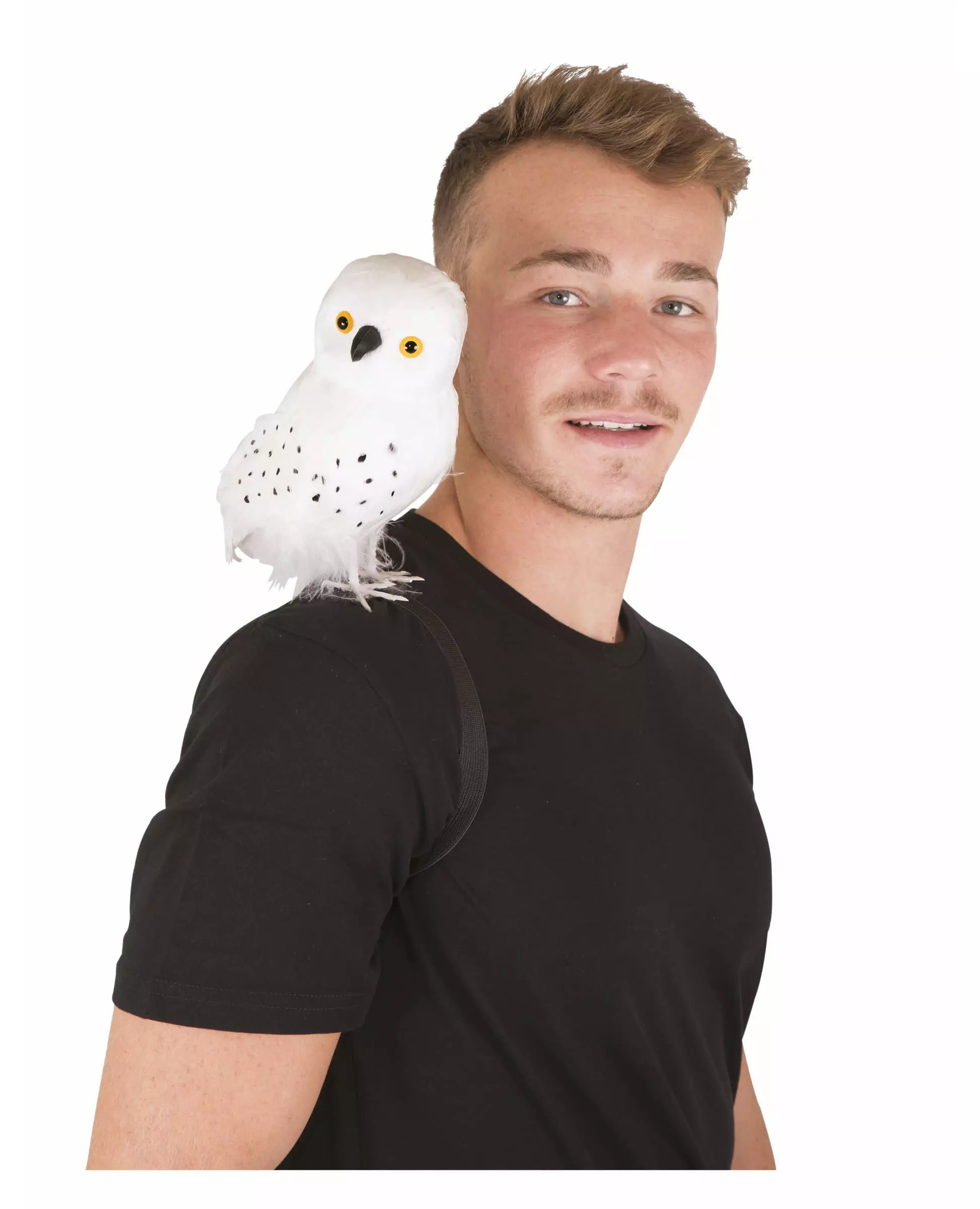 Ta med deg uglen din på tur! Denne hvite trollmannsuglen leveres med en strikk som holder den på skulderen. Den måler omtrent 20 cm i høyden. Spill som en berømt trollmann på en kostymefest eller et karneval med denne trollmannsuglen! Inkludert tilbehør: 1 trollmannsugle Materiale: Fjær + polystyren