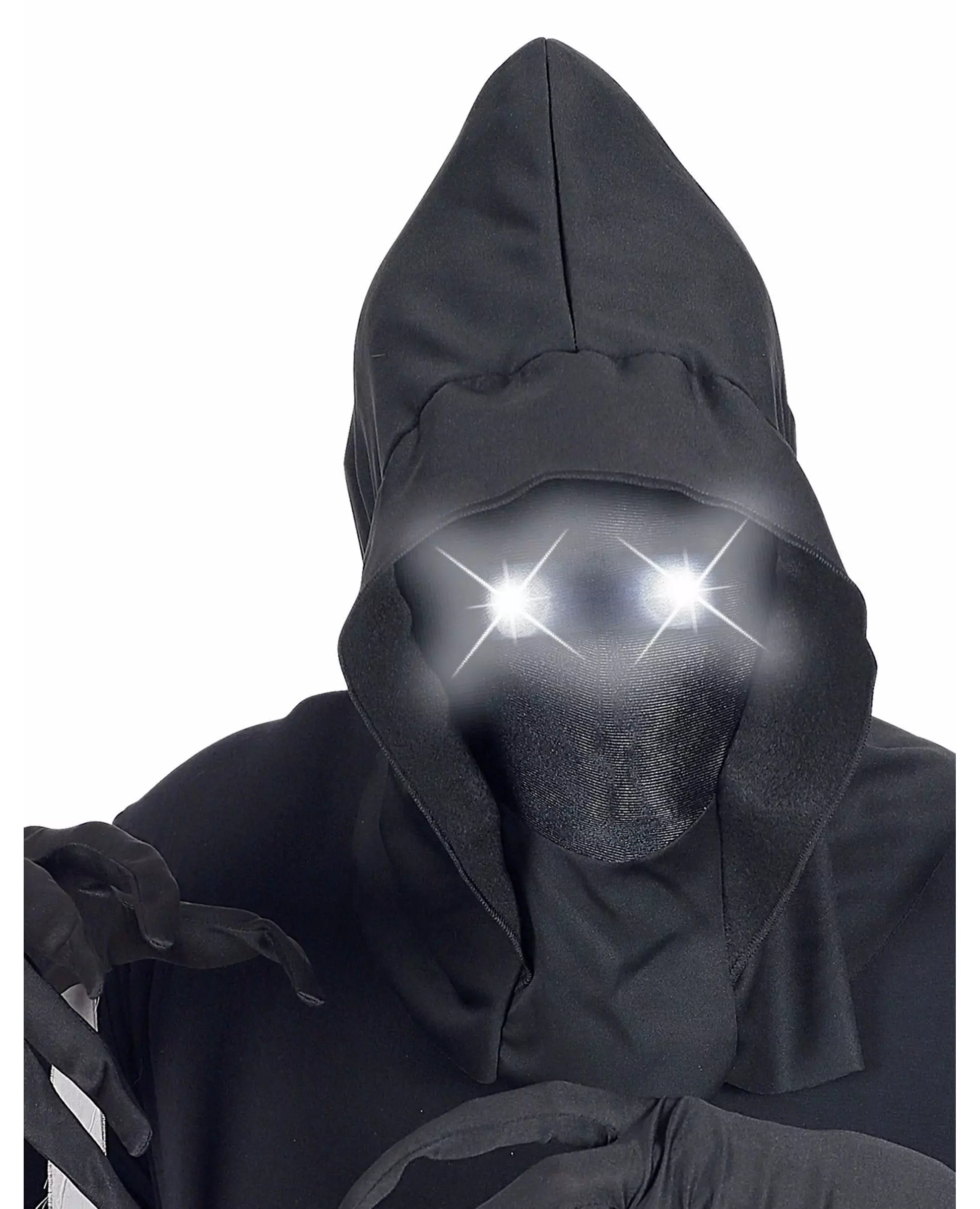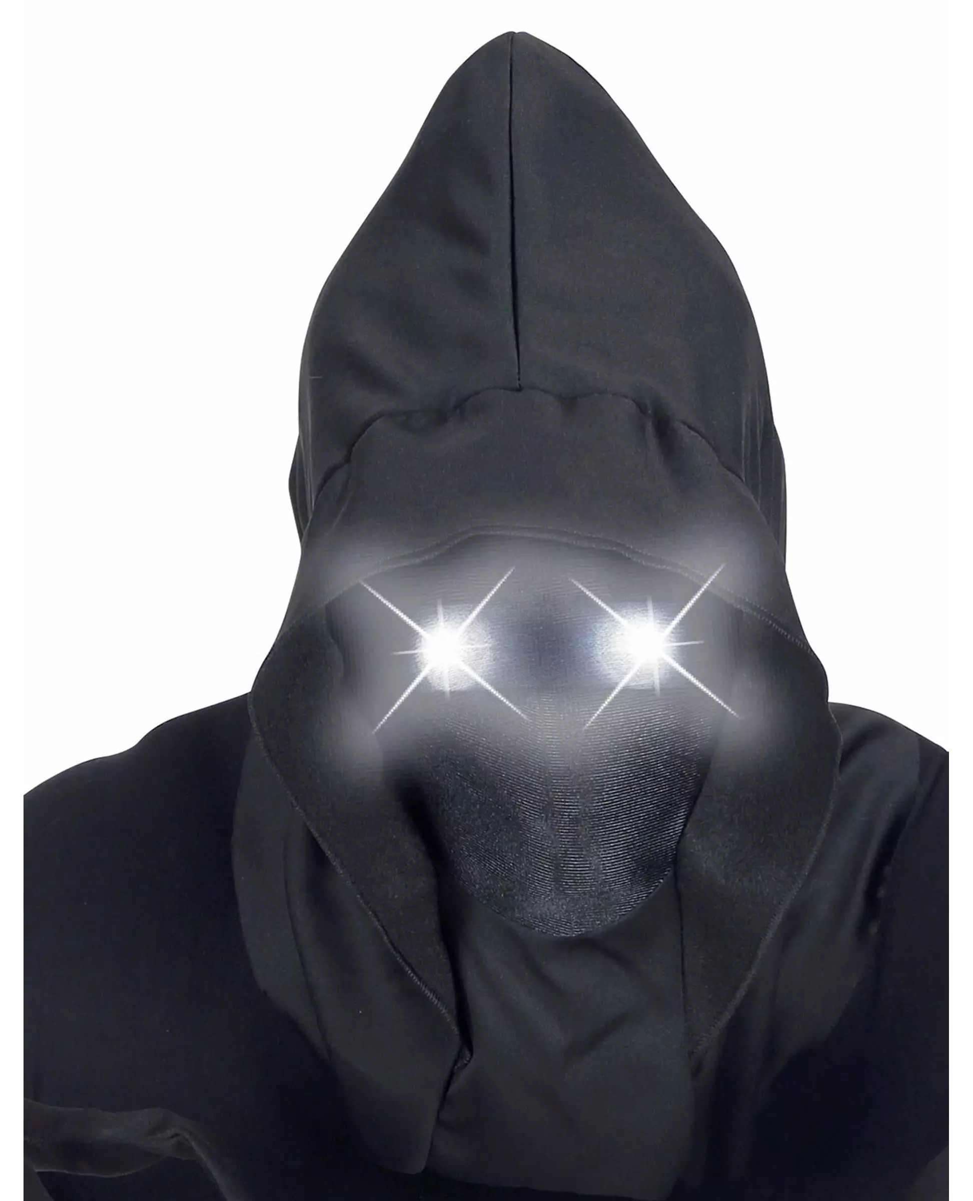 Maske med hvite lysende øyne Denne heldekkende masken er for voksne. Den dekker hele ansiktet og inkluderer også en svart hette og svart stoff som dekker ansiktet, noe som gjør den usynlig. Den har hvite lysende øyne (batterier ikke inkludert). Denne masken vil være det perfekte tilbehøret for å fullføre kostymet ditt til et utkledningsarrangement. Inkludert tilbehør: Svart maske med hvite lysende øyne