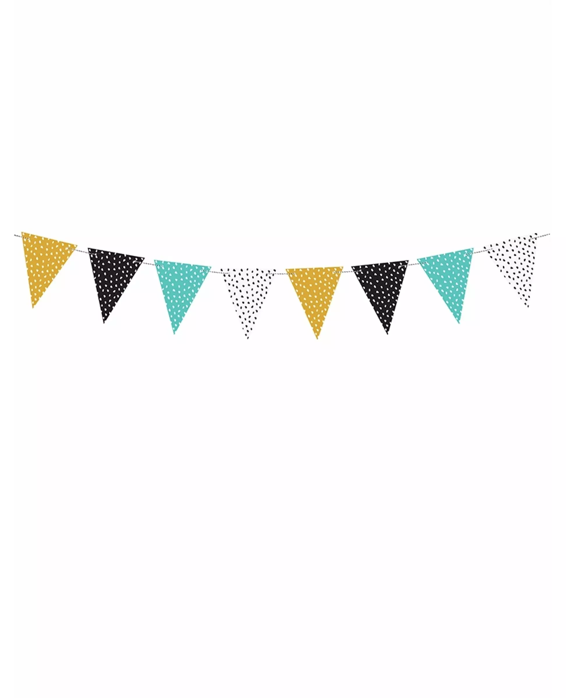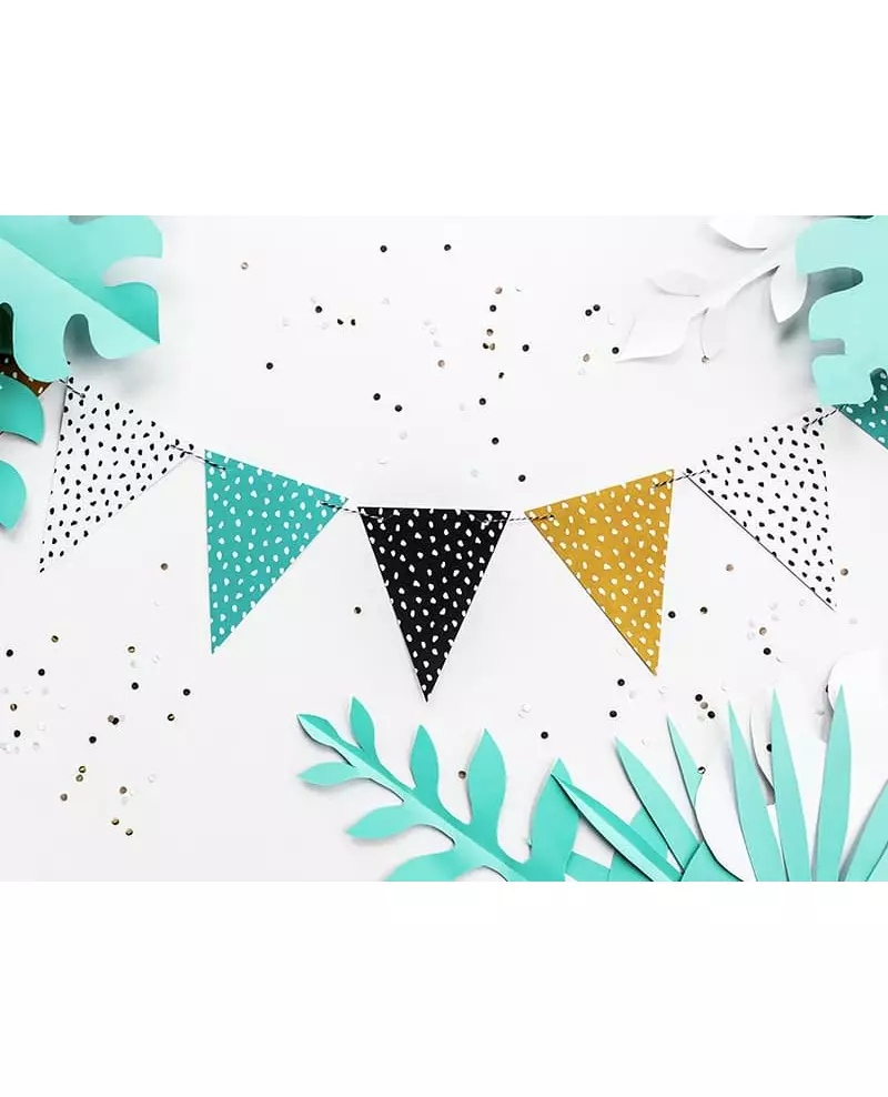 Din prikkete girlander! Denne girlanderen er laget av papp. Den måler omtrent 1,3 meter lang og 14 cm høy. Vimplene er blå, turkise, beige og hvite med små prikker. Denne girlanderen vil være perfekt for å dekorere et rom til en bursdag! Inkludert tilbehør: 1 girlander Materiale: Papp