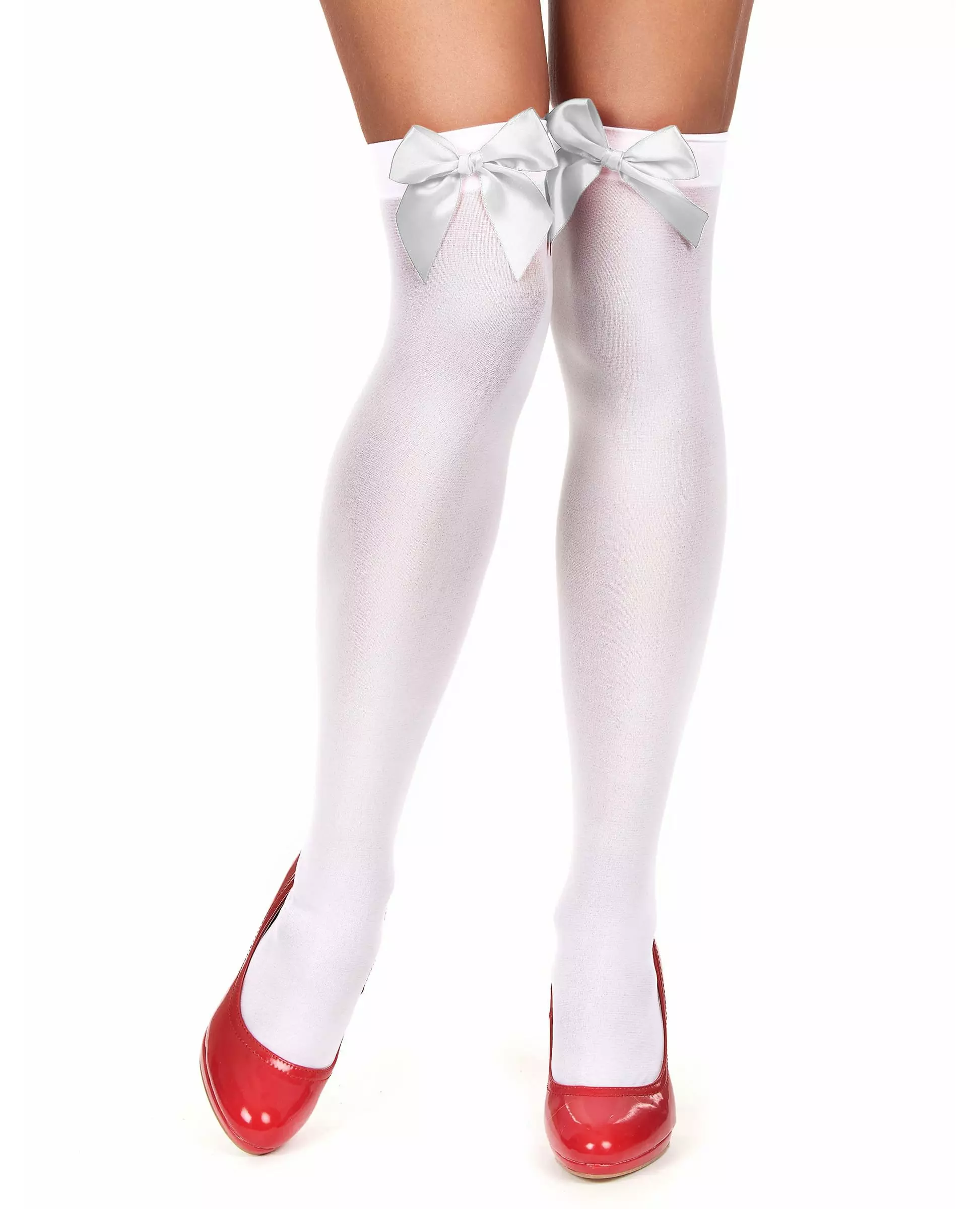 Med satengsløyfer! Disse ugjennomsiktige hvite strømpebuksene har to hvite sløyfer på lårene for voksne og holder seg oppe av seg selv i lårhøyde. Ideelle for å fullføre et sexy kostyme, eller som et supplement til kostymet ditt på karneval for eksempel.
