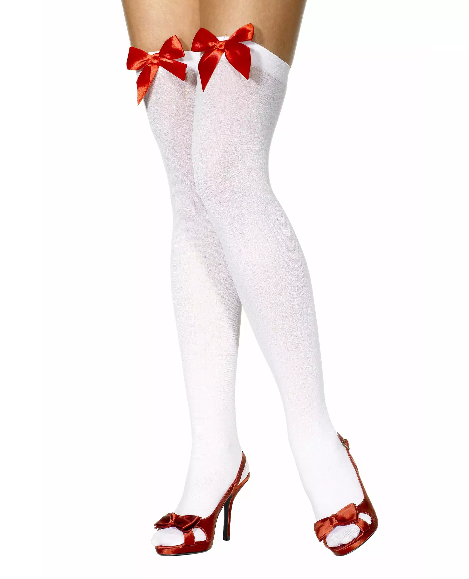 Med rød satengsløyfe! Disse ugjennomsiktige hvite strømpestrømpene for voksne er laget av nylon med en liten rød satengsløyfe foran for et garantert glamorøst utseende. Ideelle for å fullføre en sexy forkledning, eller som et supplement til kostymet ditt under karneval, for eksempel. Inkludert tilbehør: Par strømpestrømper Materiale: 100 % nylon
