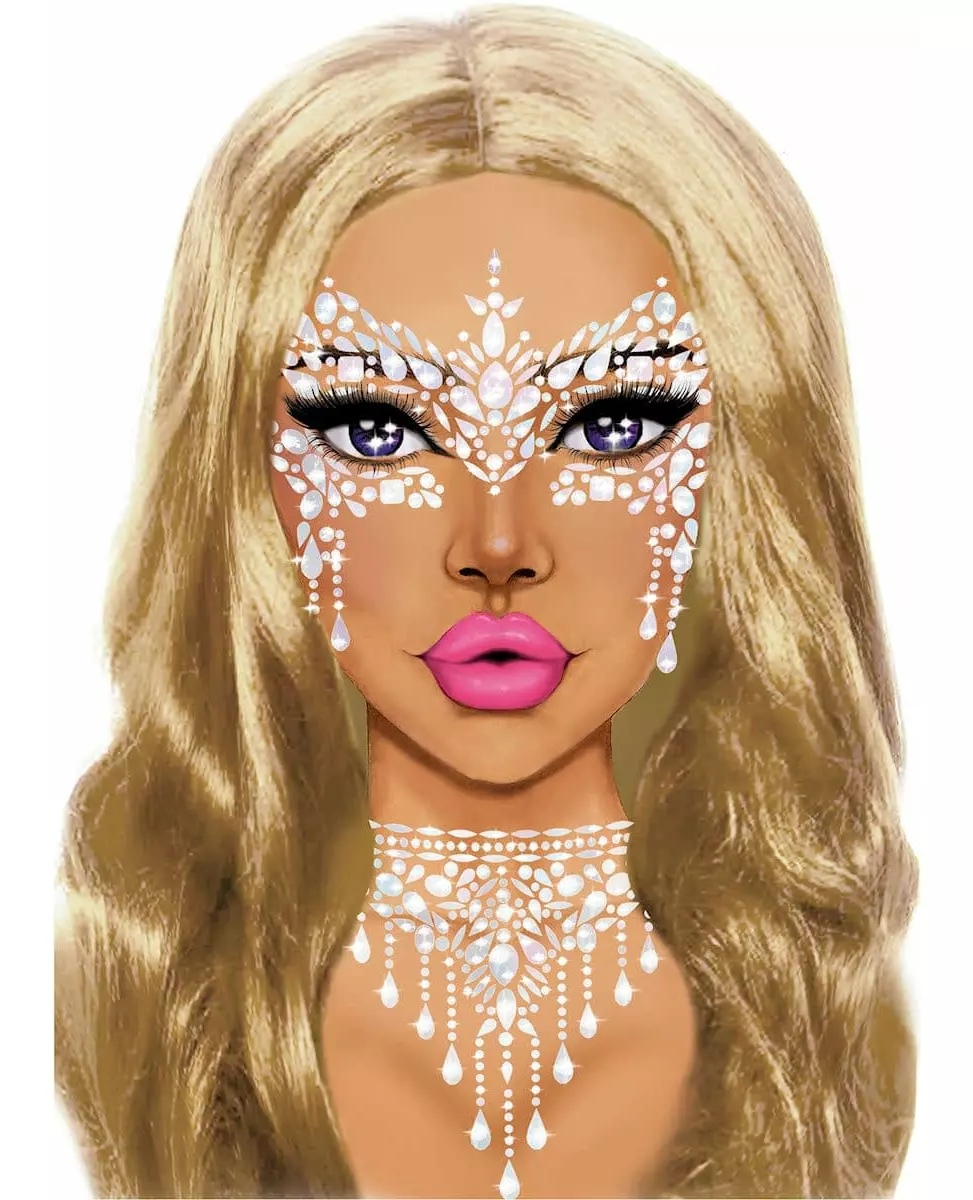 Ansiktssmykker som vil lyse opp! Disse ansiktssmykkene er for voksne. De er hvite og selvklebende. Smykkene presenteres på en plate. Du må derfor fjerne dem én etter én og deretter plassere dem på ansiktet ditt etter modellen. Disse hvite smykkene vil være perfekte for å fullføre et brudeantrekk, et isdronningantrekk og mye mer! Materiale: 100 % AKRYL. Inkludert tilbehør: Ansiktssmykker,