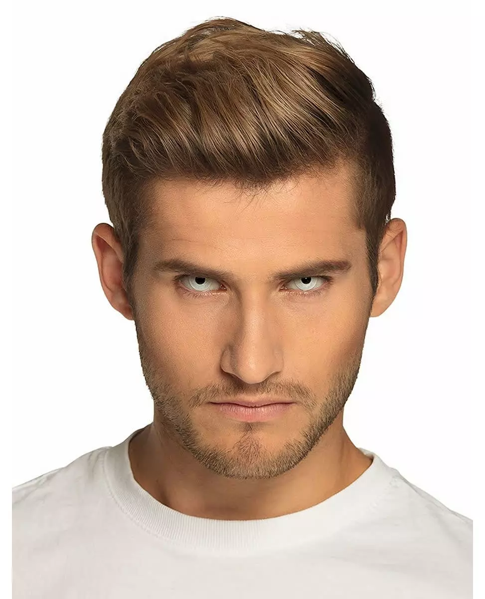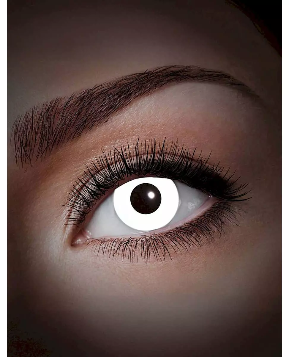 Bli sett selv i mørket! Disse hvite, nyskapende kontaktlinsene er for voksne. Disse hvite linsene ser klassiske ut i dagslys, men vil lyse i svart lys eller UV. CE0120-, ISO9001-, ISO13485- og KMP-sertifiserte, de måler 14,5 mm i diameter og kan brukes i 1 måned etter åpning. Nattugle, disse hvite UV-linsene vil gi deg et intenst utseende som vil fange lyset! Inkludert tilbehør: 2 steriliserte kosmetiske linser Materiale: HEMA 58 %, fysiologisk serum 42 %, saltvannsløsning 0,9 %