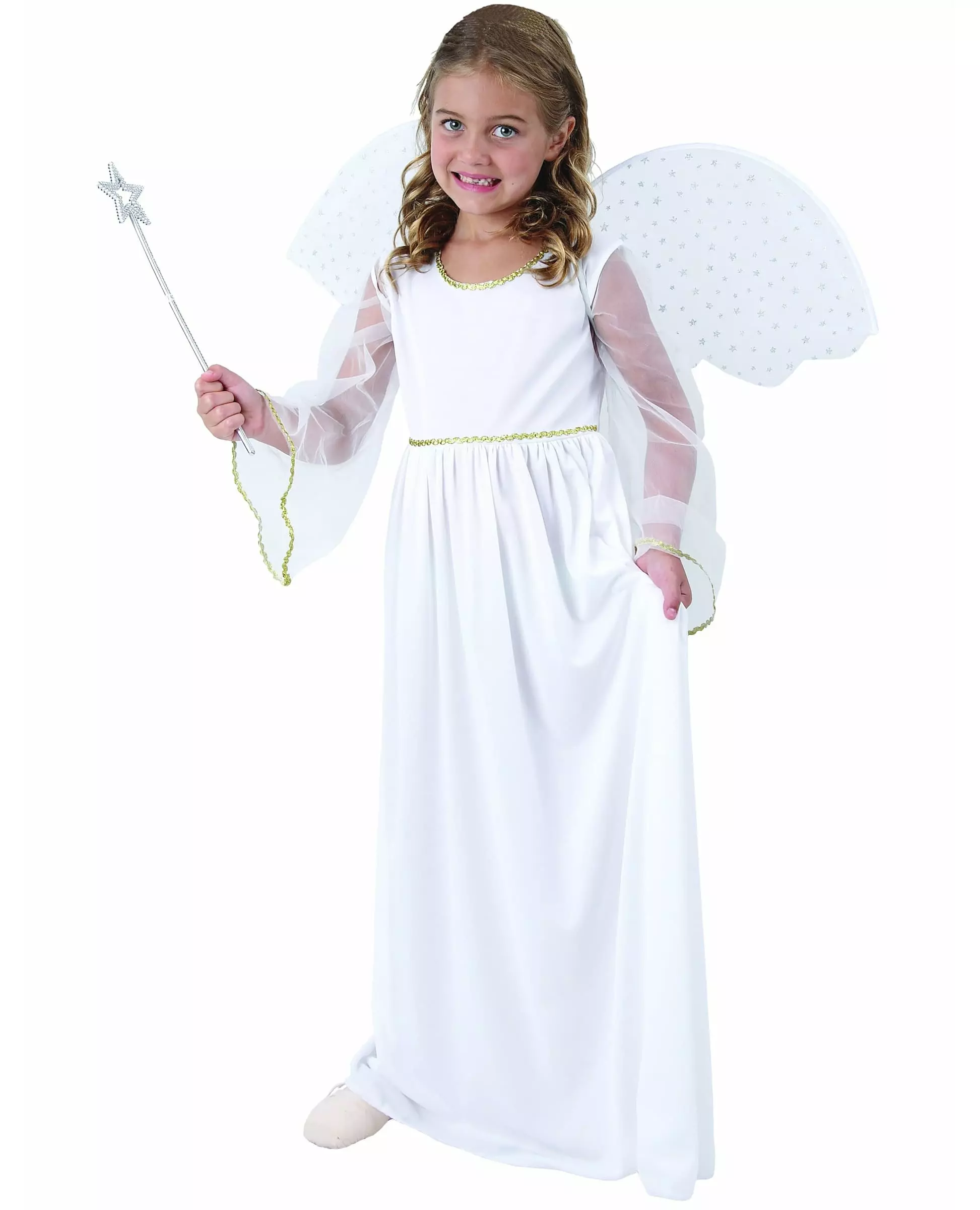 Bli en ekte liten engel til jul. Dette hvite engelkostymet for jenter består av en kjole og et par vinger (trist og sko er ikke inkludert). Den lange kjolen er hvit med gulldetaljer i midjen, halsen og mansjettene. De lange ermene er laget med hvitt slør. For ekstra komfort har kjolen en elastisk linning. Et par vinger fullfører dette engelkostymet. Disse er laget med hvitt slør med små sølvstjerner. De bæres som en ryggsekk med strikker. Dette kostymet vil være perfekt for å forvandle deg til en søt liten engel til jul eller karneval. Inkludert tilbehør: Kjole Vinger Materiale: 100 % polyester Pleie: Håndvask