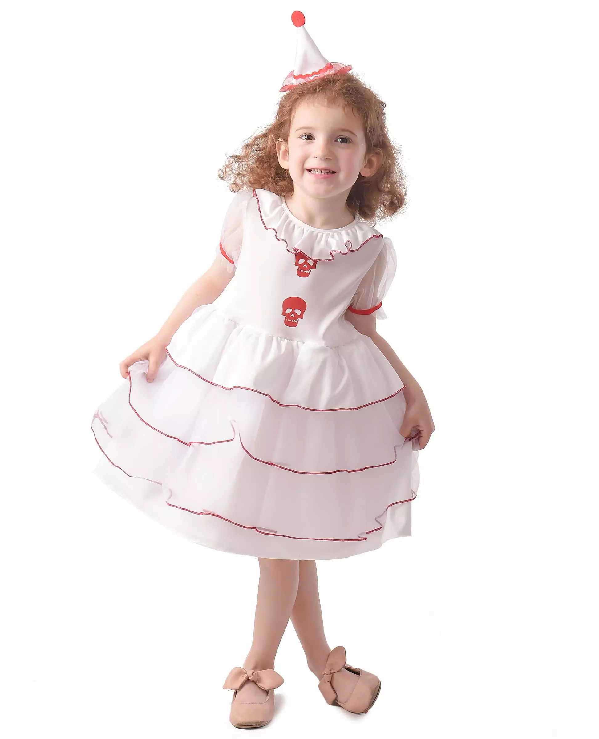 Et klovnekostyme til Halloween! Dette klovnekostymet for jenter består av en kjole og et pannebånd (sko ikke inkludert). Kjolen er hvit med rød kant. På toppen er den dekorert med røde hodeskaller. Ermene er laget av gjennomsiktig hvit tyll med en rød kant som matcher bunnen av kjolen. Jordbærkragen er også kantet av en rød kant. Pannebåndet representerer en spiss hatt i samme farger som kjolen. Med dette klovnekostymet vil datteren din legemliggjøre en bedårende, skremmende klovn på en Halloween-fest! Inkludert tilbehør: Kjole Pannebånd Stell: Håndvask