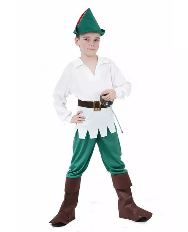 Hatt inkludert! Dette skogsguttkostymet inkluderer en topp, bukser, et belte og en hatt (resten er ikke inkludert). Toppen er hvit med lange ermer og ribbestrikk nederst. Kragen er vid med mansjetter. Buksene med elastisk midje er grønne med brune støveltrekk laget av tykk filt sydd direkte på dem. Filtbeltet er også brunt med en falsk gullspenne. Det festes med borrelås bak. Til slutt er hatten, laget av samme materiale som beltet, grønn og fullfører antrekket perfekt. Dette kostymet vil være ideelt for en bursdagsfest eller til karneval, for å leke de storhjertede bandittene. Inkludert tilbehør: Bukser med støvelovertrekk T-skjorte Hatt Belte Materiale: 100 % polyester Vedlikehold: Håndvask