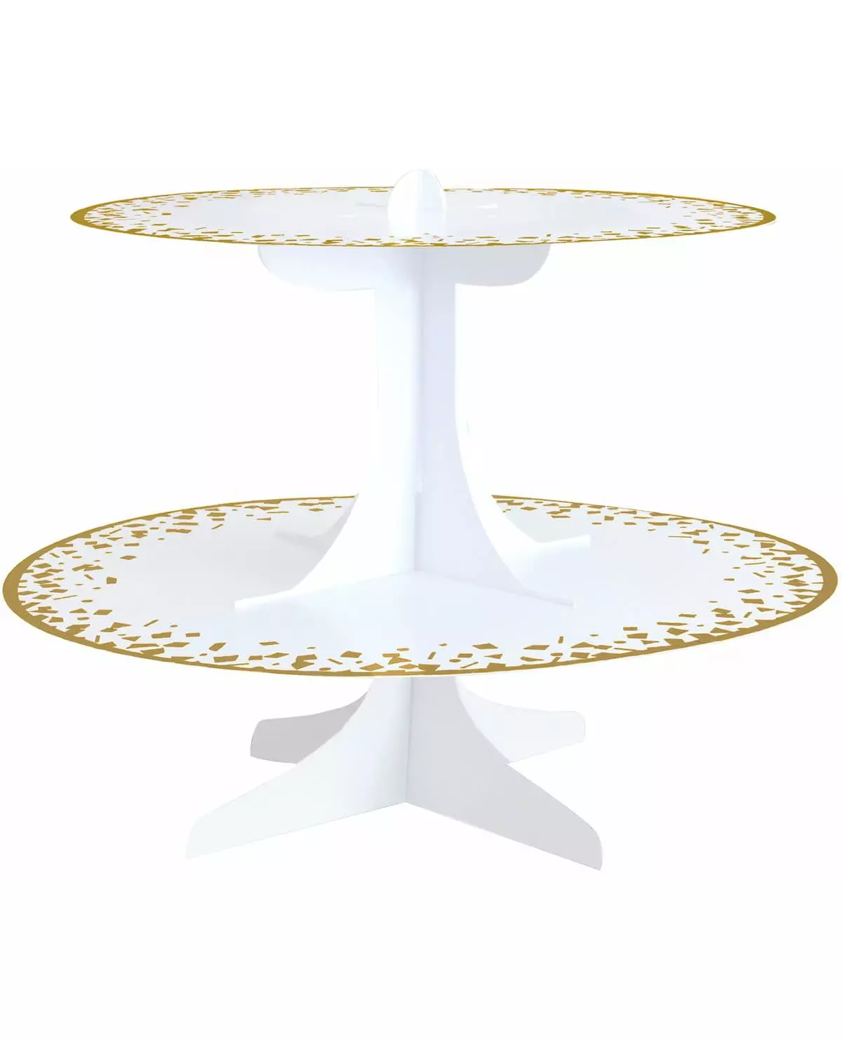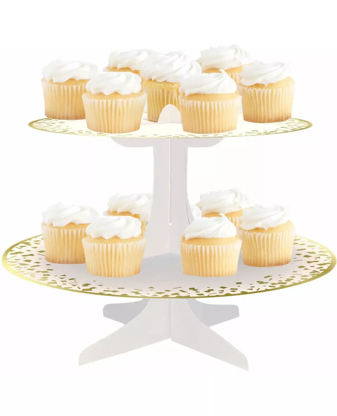 En elegant utstilling! Dette cupcake-stativet i hvitt og gullfarget papp måler omtrent 31 x 24 cm når det er montert. Stativet med to etasjer har plass til opptil 12 cupcakes i normal størrelse. Denne cupcake-hyllen vil være perfekt for å presentere kakene dine på en bursdag, nyttårsaften eller en temafest! Inkludert tilbehør: 1 cupcake-stativ Materiale: Papp