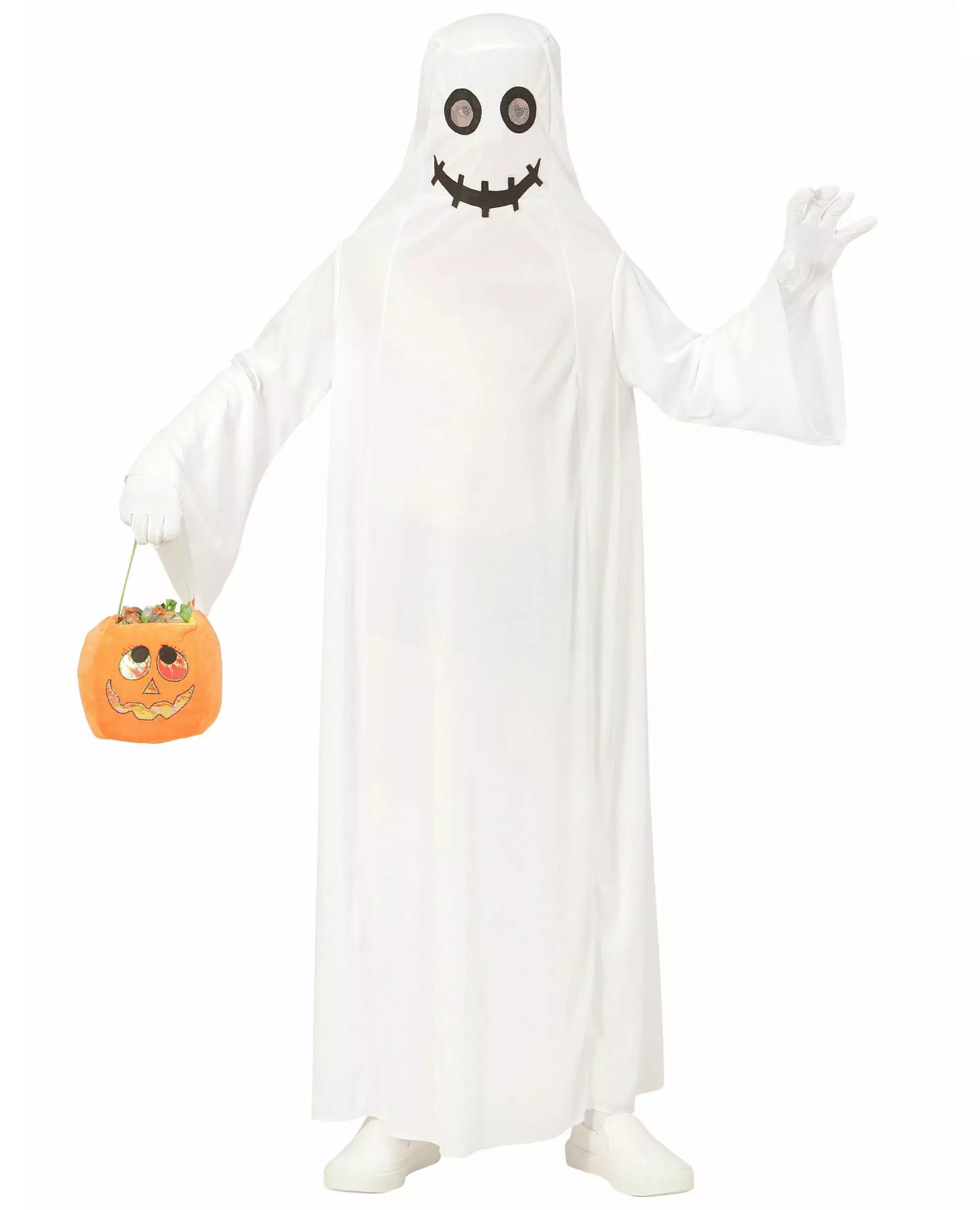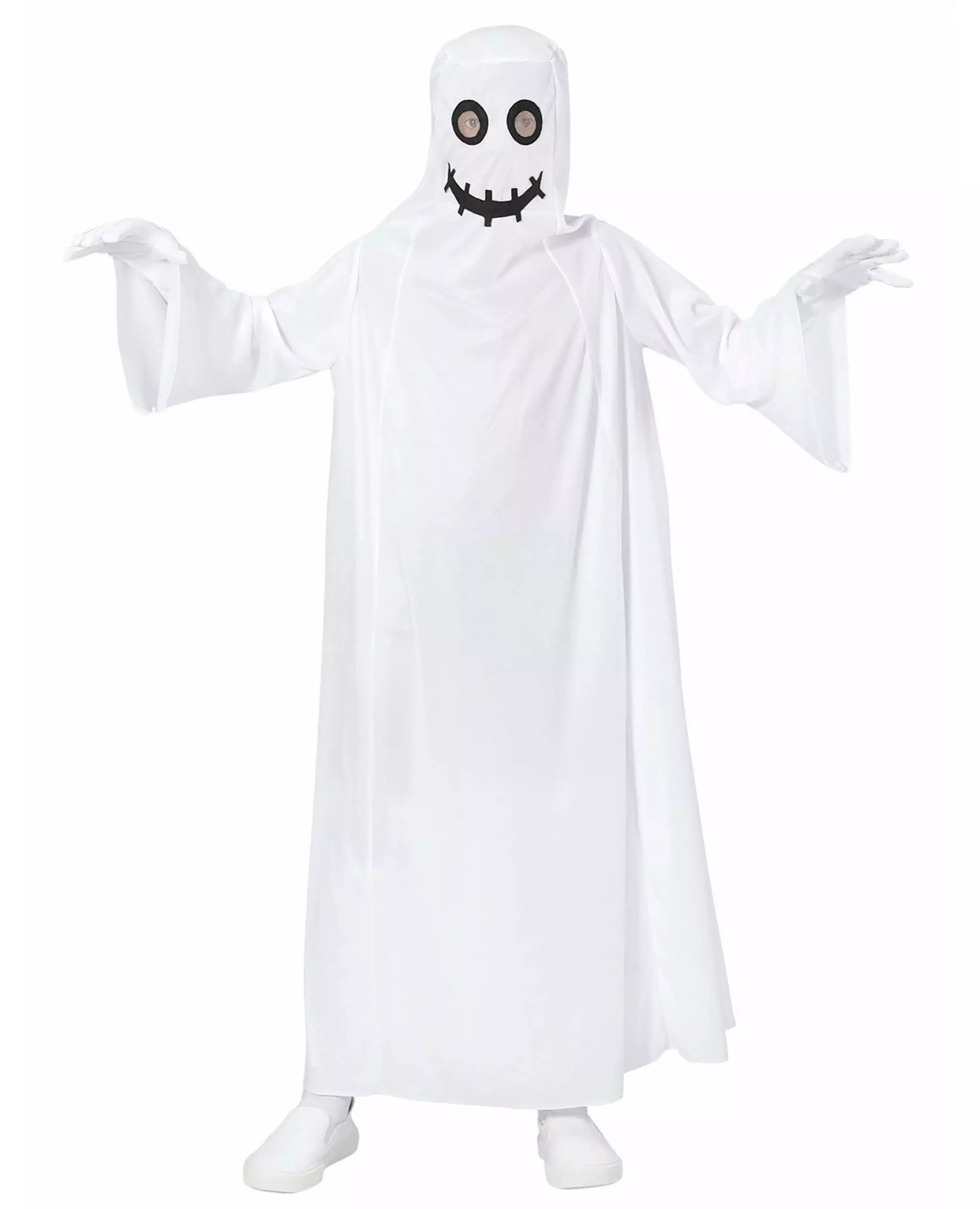 Halloween-spøkelse Dette spøkelseskostymet er for barn, det består av en kjole (hansker ikke inkludert). Kjolen er hvit, med utsvingte ermer. På ansiktet er det tegnet et svart smil samt en åpning for øynene. Denne åpningen er markert med svarte sirkler som omgir øynene. Dette kostymet vil være ideelt for barnet ditt til et utkledningsarrangement eller bare til Halloween. Inkludert tilbehør: Kjole, Materiale: 100 % polyester,