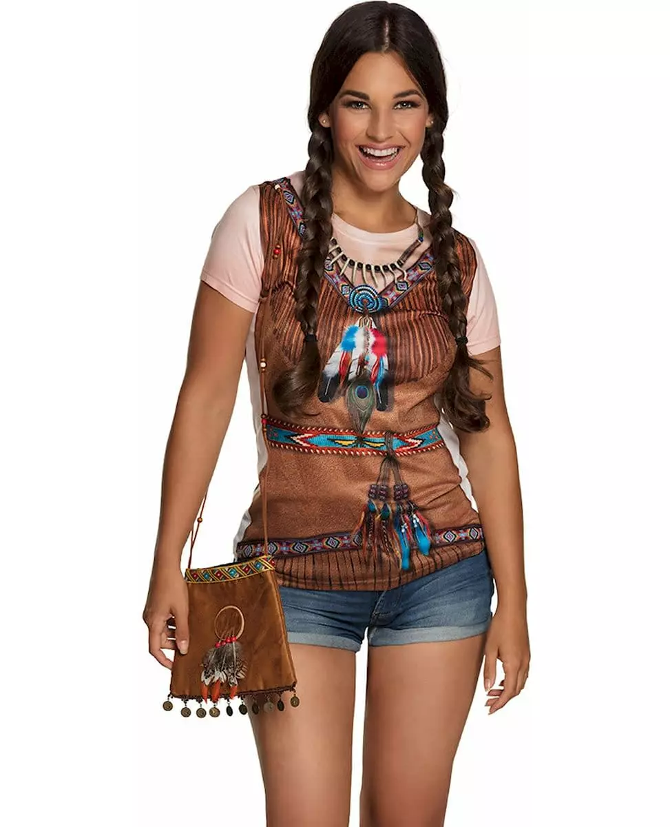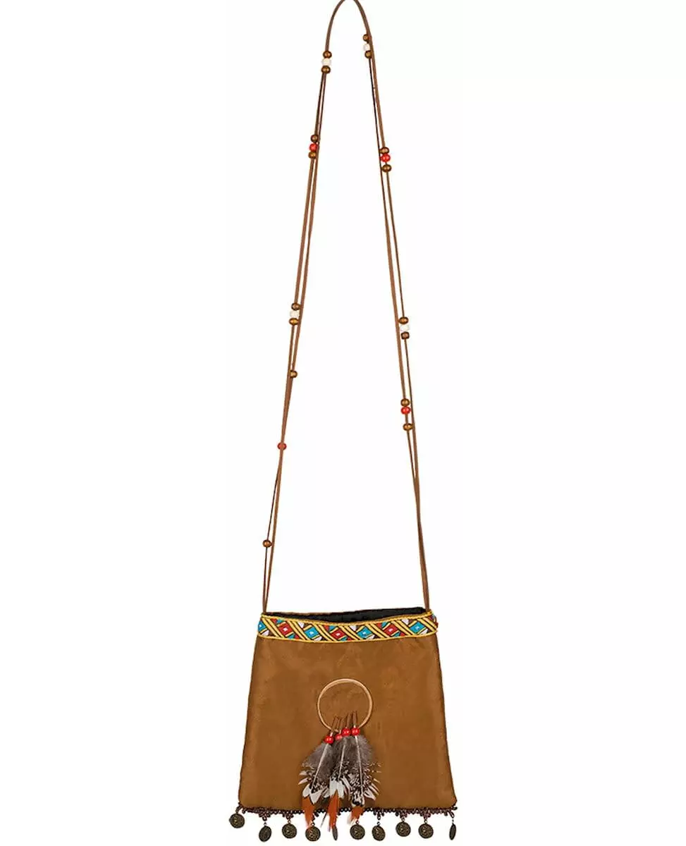 Perfekt ned til minste detalj! Denne indiske vesken måler omtrent 21 cm. Den er laget av kamelfarget stoff med dyrehudlignende utseende. Den har et langt, fôret håndtak dekorert med perler. Denne vesken er dekorert med en kant med fargerike indianske motiver. I midten av vesken er en drømmefanger dekorert med grå, hvite og brune kunstfjær. Denne vesken vil være perfekt for å pynte opp dine indiske kostymer, og lar deg oppbevare eiendelene dine samtidig som du har hendene fri under fester med Vill Vesten-tema eller westernfilmer! Inkludert tilbehør: veske Mål: 21 cm