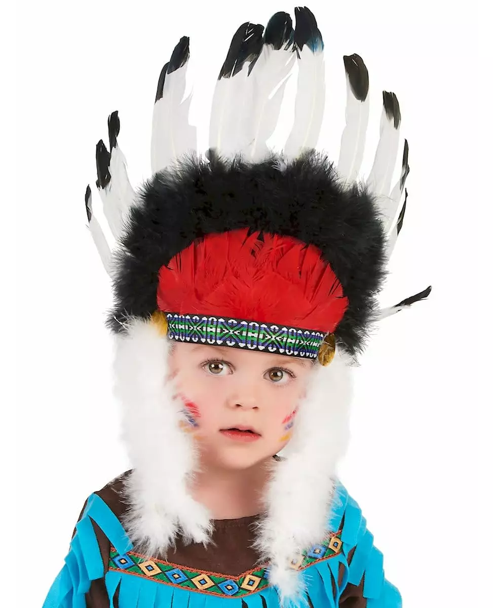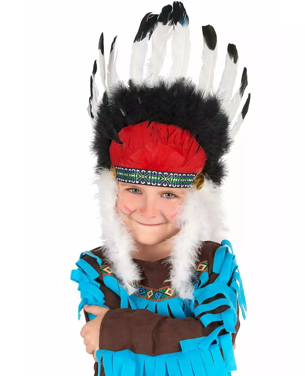 Den store høvdingen av alle indianere! Dette hodeplagget i form av en indianerhøvding selges separat og er for barn. Det består av et grønt, blått og hvitt pannebånd med indianske motiver, hvor det er festet falske røde, hvite og svarte fjær. Dette hodeplagget i form av en vestlig indianer er det essensielle tilbehøret for å fullføre barnets antrekk til neste karneval eller bursdagsfesten deres med temaet cowboys og indianere fra det fjerne vesten! Inkludert tilbehør: Hodeplagget Materiale: Polyester Stell: Håndvask