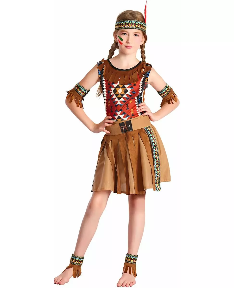 Forvandle datteren din til en pen liten indisk jente med dette kostymet! Dette indiske jentekostymet består av en kjole, et belte, et pannebånd, armbånd og ankelbånd. Toppen av kjolen har indiske mønstre med brede frynser ved kragen. Nederdelen er lysebrun. Et belte med lange frynser fremhever midjen. Ankelbåndene og armbåndene består alle av et bånd med fargerike mønstre, som det er sydd frynser på. Til slutt fullfører et hårbånd dette pene kostymet. Dette indiske jentekostymet vil være perfekt for en fest, western-tema eller til karneval. Tilbehør inkludert: Kjole Belte Pannebånd 2 Armbånd 2 Ankelbånd Materiale: 100 % polyester Vedlikehold: Håndvask