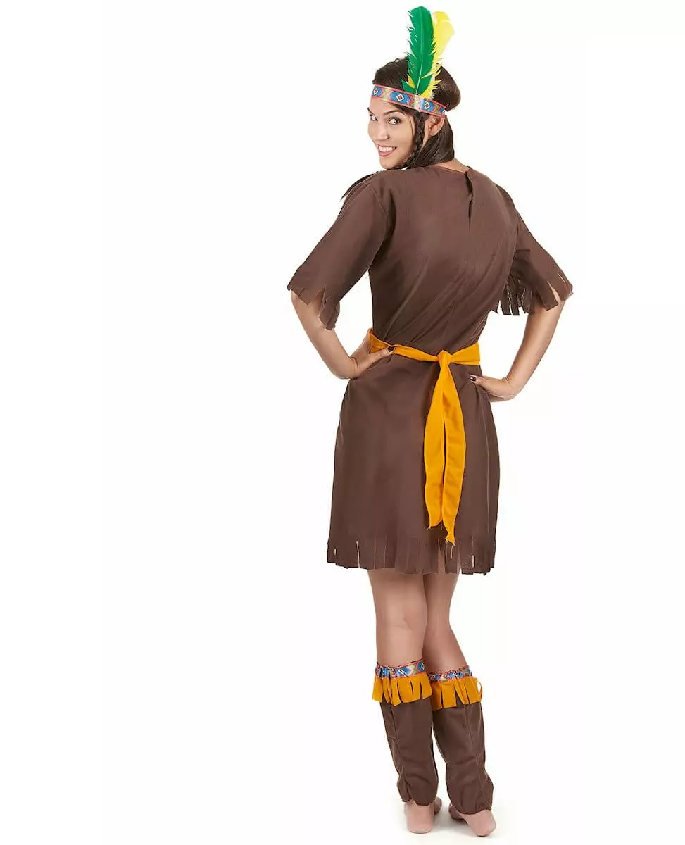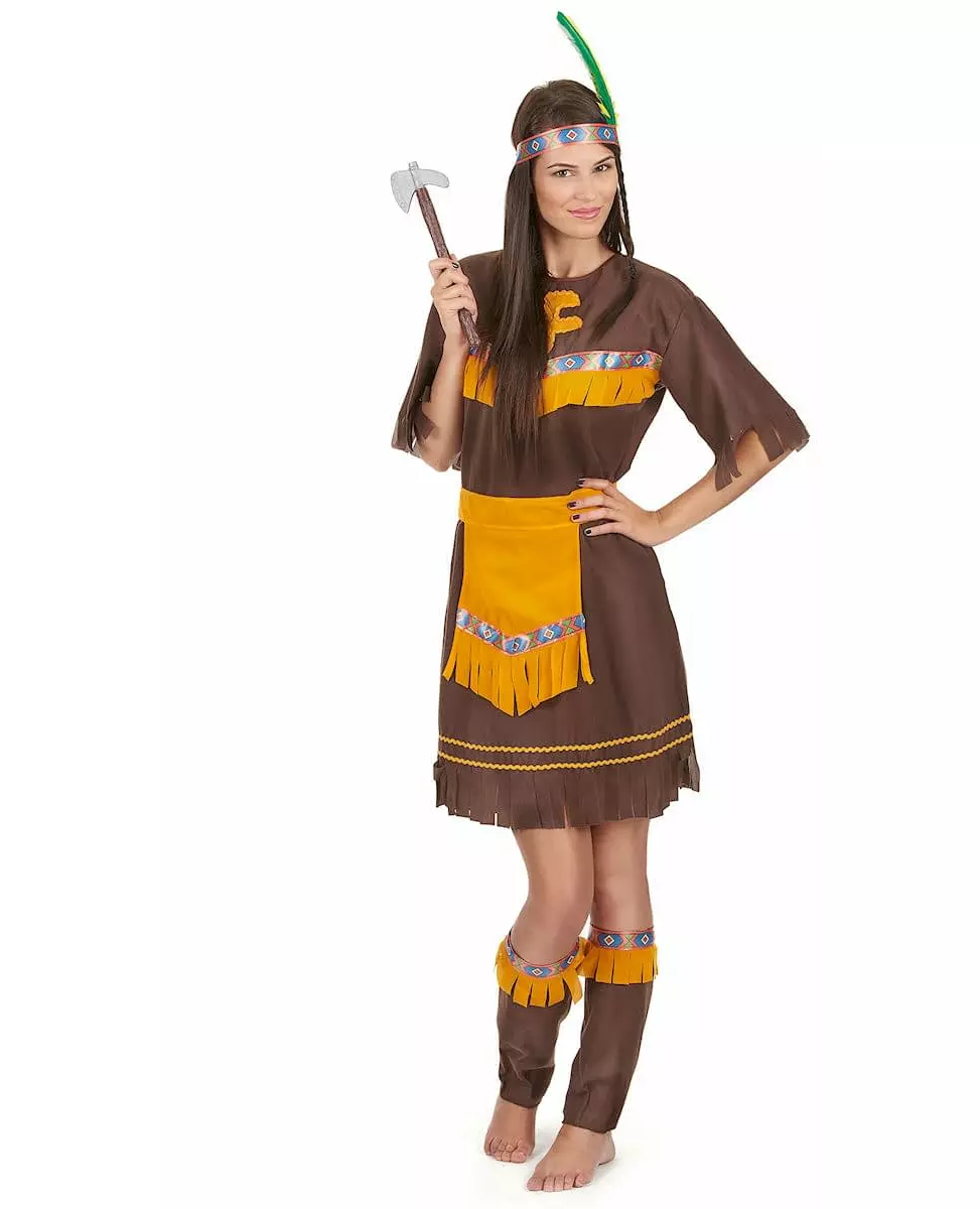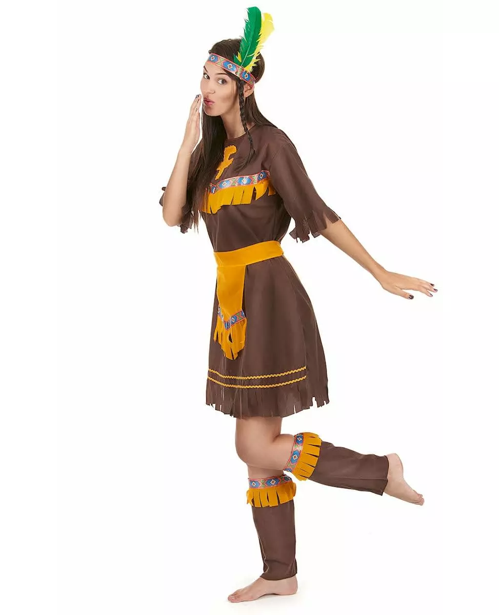 En ekte Apache! Dette indianerkostymet for kvinner består av en kjole, leggings, et belte og et pannebånd. Kjolen er brun og tettsittende i midjen. Hver del av kostymet er utsmykket med indianermotiver. Pannebåndet består av tre fjær: gul, hvit og grønn. Dette kostymet er perfekt for å kle seg ut til et show, en utkledningsfest eller et karneval. Inkludert tilbehør: Kjole, pannebånd, belte, leggvarmere.