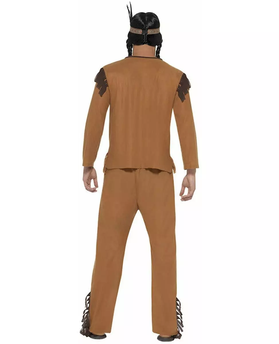 en stammehøvdings sko Dette indiske kostymet for menn består av en topp, bukser og et pannebånd med fjær (parykk og sko er ikke inkludert). Toppen er dekorert med et stammemønster og fjær trykt på brystet. I likhet med buksene er den dekorert med frynser. Pannebåndet har en stor fjær. Den holdes på plass med en komfortabel strikk. Dette indiske antrekket er perfekt for en fest med Vill Vest-tema eller et karneval. Inkludert tilbehør: Topp, bukser, pannebånd, materiale: 100 % polyester. Vedlikehold: Håndvask.