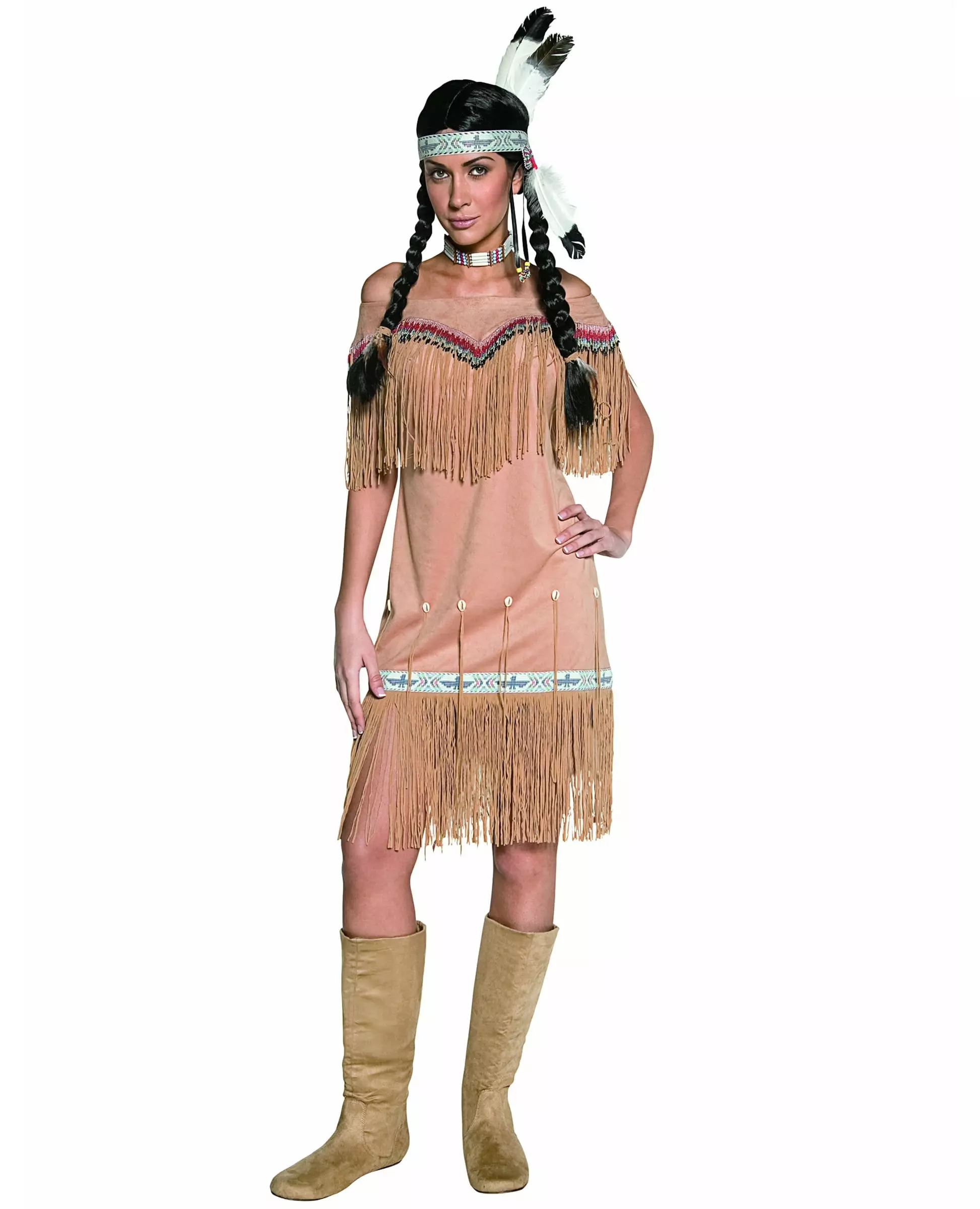 Ideelt! Indisk kostyme for kvinner bestående av en kjole. Kjolen representerer et indisk antrekk. Den er beige og dekorert med frynser. Båthalsen avslører skuldrene. Dette kostymet er perfekt for å legemliggjøre en ekte indianer til karneval eller under kostymefester. Inkludert tilbehør: Kjole Materiale: 100 % polyester Pleie: Håndvask