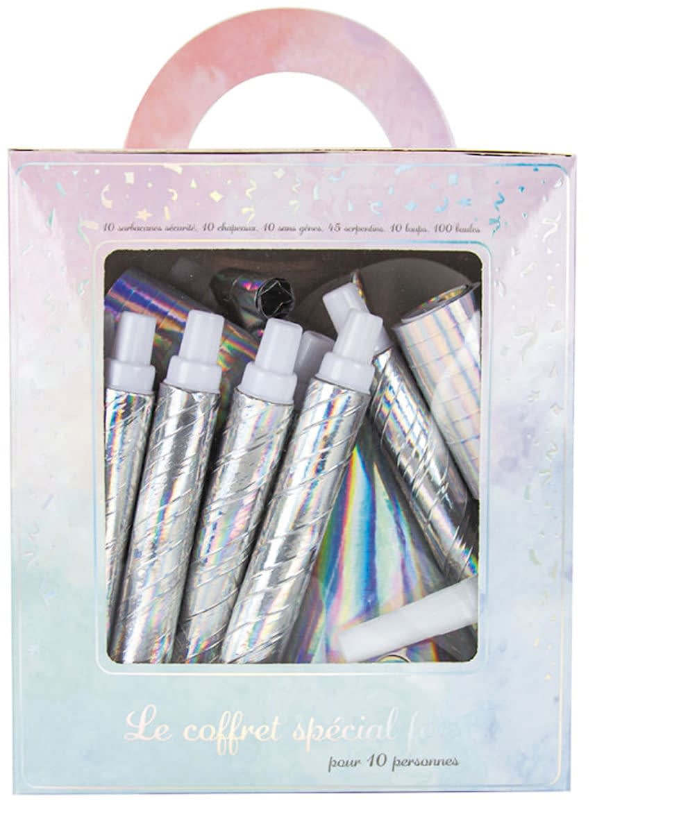 Gi festene dine litt gnist med denne iriserende festgaveesken for 10 personer! Denne iriserende festgaveesken for 10 personer inkluderer: 10 hatter, 10 disketter, 30 serpentiner og 10 masker. De 10 iriserende papirhattene har en holografisk finish som fanger lyset og glitrer fra alle vinkler. De 10 iriserende diskettene gir et lekent preg med sin skinnende overflate og festlige klang. De 30 iriserende serpentinene er lette og enkle å kaste, og skaper en glitrende dusj rundt i rommet. De 10 iriserende ulvene vil fullføre gjestenes kostymer og gi festen et mystisk preg. Perfekt for anledninger som nyttår, bursdager eller temafester, er denne iriserende festgaveesken designet for å lyse opp enhver feiring med sitt lyse og festlige tilbehør. Inkludert tilbehør: -10 blåsepistoler -100 baller -10 hatter -10 skylapper -30 serpentiner -10 ulver
